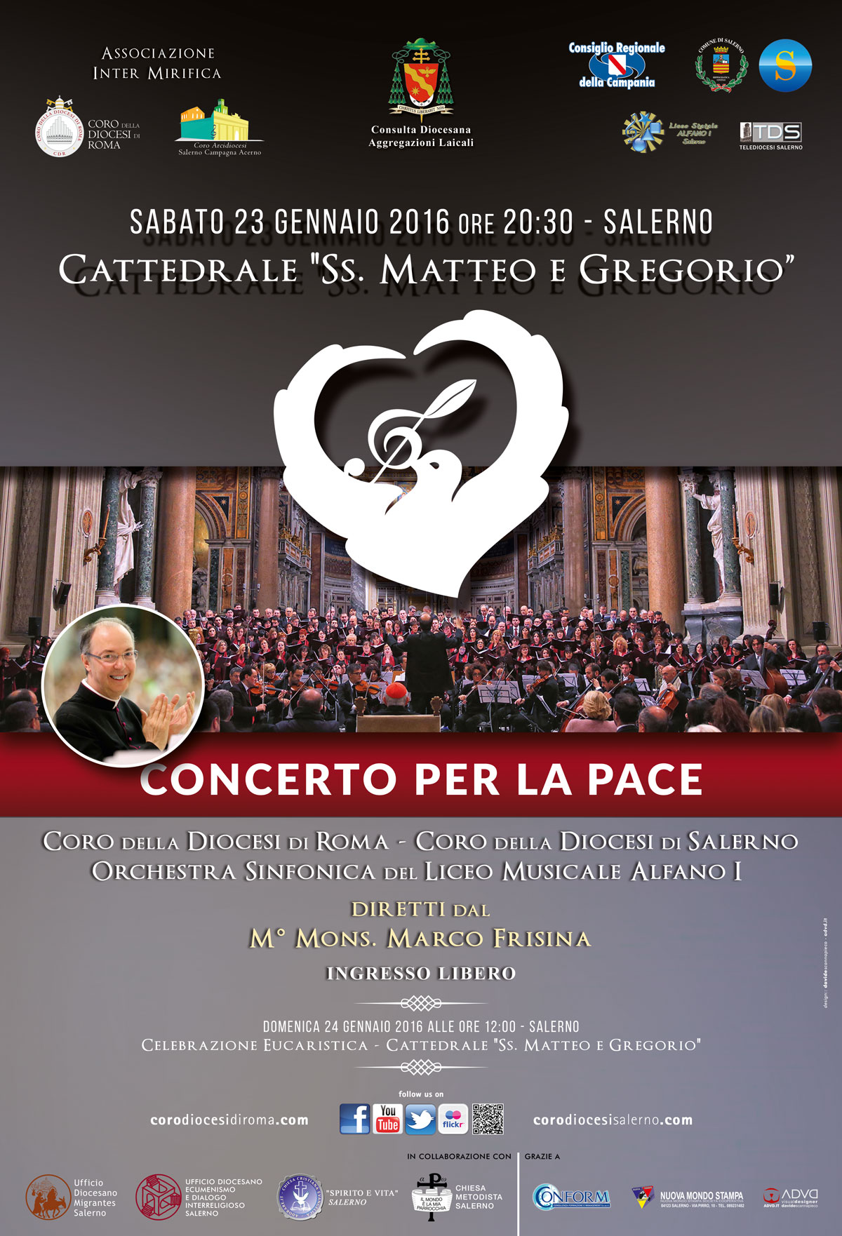 Sabato 23 gennaio, alle ore 20.30, presso la Cattedrale "SS. Matteo e Gregorio" di Salerno, si terrà il Concerto per la pace. Ad esibirsi saranno il Coro della Diocesi di Roma, il Coro della Diocesi di Salerno e l'Orchestra Sinfonica del Liceo Musicale Alfano I, diretti dal M° Mons. Marco Frisina. L'ingresso è libero.