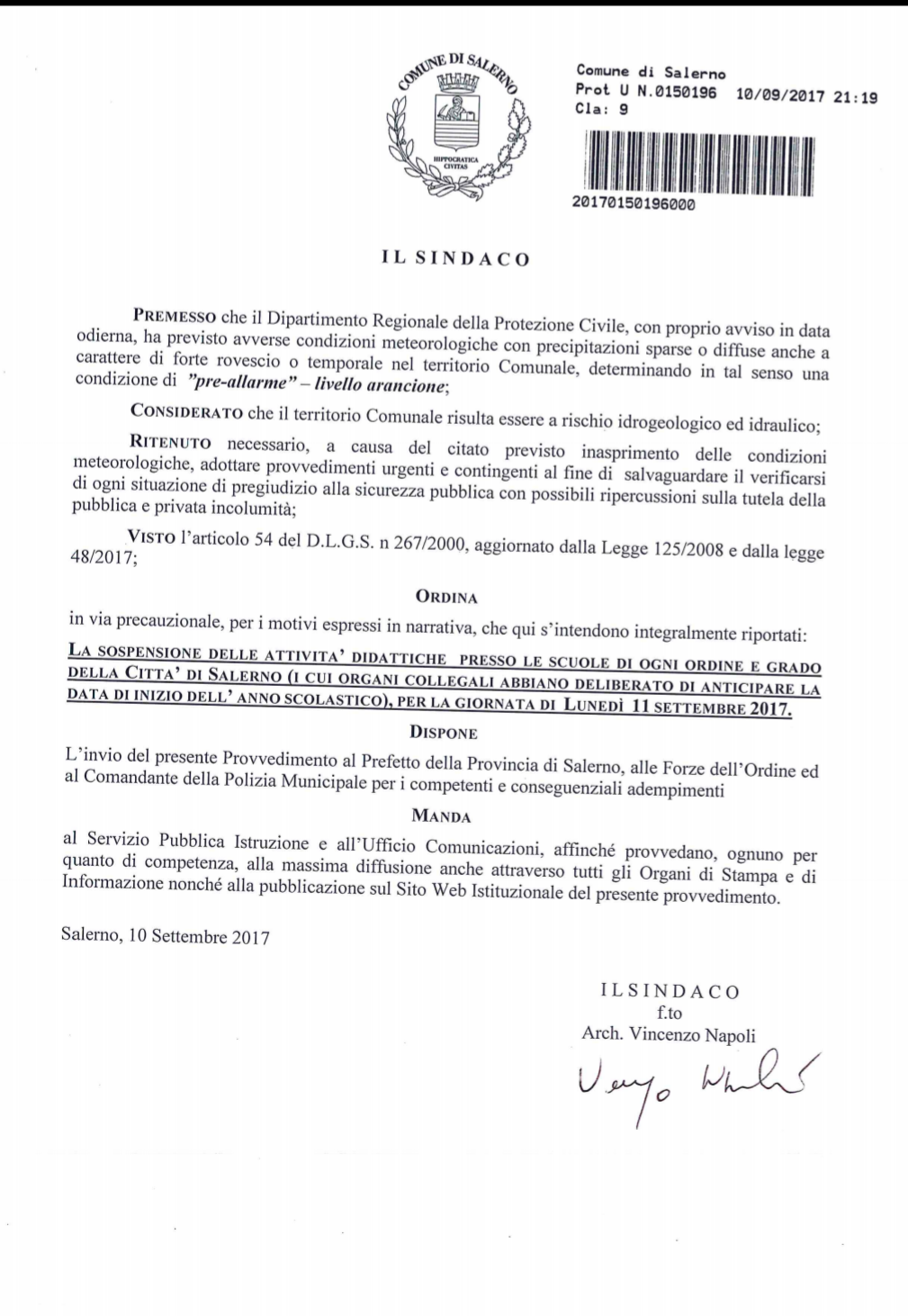 Il sindaco di Salerno, Vincenzo Napoli ha disposto per la giornata di domani, 11 settembre, la chiusura, in via precauzionale, di ogni scuola di ordine e grado a seguito dell’allerta meteo. L’ordinanza di chiusura per pubblica incolumità si riferisce ai soli istituti scolastici che avevano deciso l’apertura anticipata. Si chiede la massima diffusione della notizia onde evitare episodi di disagi per tutte le famiglie interessate. Nella giornata di domani, in base all’evolversi delle condizioni meteo, si deciderà se prolungare o meno la chiusura dei plessi.