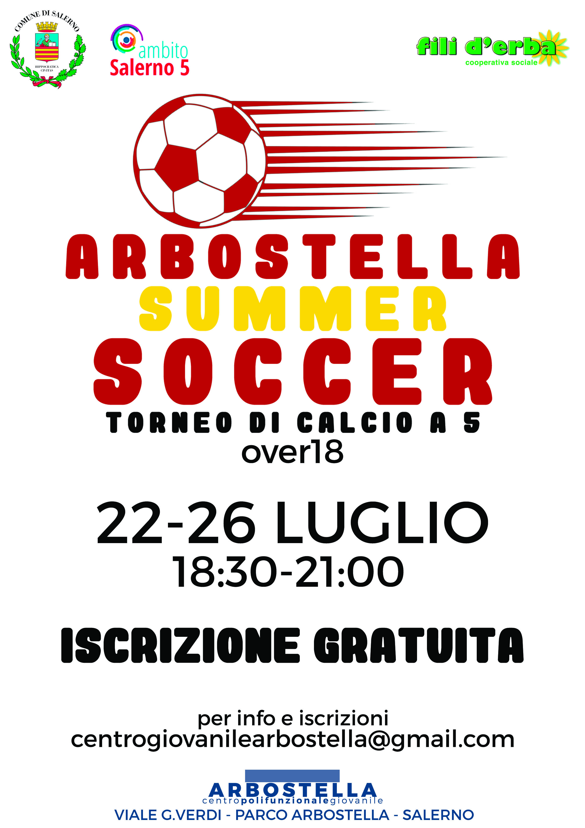 La Cooperativa Sociale “Fili d’erba” comunica l’apertura delle iscrizioni al torneo gratuito di calcio a 5 "Arbostella Summer Soccer" che si terrà presso il Centro Polifunzionale Giovanile “Arbostella” in Viale G. Verdi. Il torneo è organizzato per partecipanti dai 18 anni di età in su: è possibile iscriversi fino al 13 luglio 2019 ore 21:00. Le partite si svolgeranno da lunedì 22 luglio a venerdì 26 luglio dalle ore 18:30 alle ore 21:00. Ogni squadra sarà composta da un numero massimo di giocatori pari ad 8, di cui 5 titolari e 3 riserve.