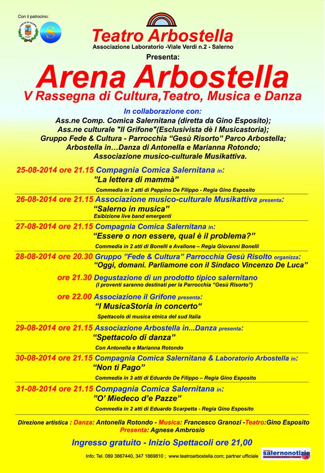 Si è tenuta lunedì 25 agosto, presso il Teatro Arbostella di Salerno, la conferenza stampa di presentazione della V edizione dell'Arena Arbostella. La manifestazione è patrocinata dal Comune di Salerno che ha visto presenti come rappresentanti di Palazzo di Città l'assessore alla Cultura Ermanno Guerra e il consigliere di Salerno per i Giovani Angelo Caramanno. La rassegna, illustrata dalla presidente dell'Associazione Laboratorio Teatro Arbostella Immacolata Caracciuolo e dal direttore artistico Gino Esposito prenderà il via lunedì 25 agosto e si terrà per 7 giorni sino al 31 agosto e sarà un contenitore di cultura,teatro, musica e danza. Nel dettaglio, ci saranno ben 4 spettacoli teatrali della Compagnia Comica Salernitana, la stabile dell'Arbostella diretta dallo stesso Gino Esposito che metterà in scena altrettanti capolavori teatrali ovvero "La Lettera di Mammà", di Peppino De Filippo (la serata iniziale del 25 agosto), "Essere o non essere..qual'è il problema" da un inedito di Giovanni Bonelli e Andrea Avallone il 27 agosto. Gran finale il sabato 30 con il celebre "Non ti Pago" di Eduardo De Filippo, e domenica 31 con il testo scarpettiano tutto da ridere "O Miedeco d'è pazze". Ma non solo teatro. Si potrà ascoltare buona musica, grazie alla direzione artistica di Francesco Granozi, con l'associazione Musikattiva che il 26 agosto presenterà "Salerno in Musica", un esibizione di band emergenti locali tutte di ottimo spessore, oppure ascoltare giovedi 28 agosto i famosissimi Musicastoria con il meglio della musica etnica del sud Italia, condita da canti e balli folkloristici popolari. E spazio come ogni anno anche alla danza con l'Associazione Arbostella...in Danza di Antonella e Marianna Rotondo che daranno ritmo e verve alla platea dell'Arena con le esibizioni dei loro ragazzi. Ma come successe l'anno scorso, anche quest'anno ci sarà un momento dedicato alla riflessione. Infatti la Parrocchia Gesu Risorto del Parco Arbostella ha organizzato per la serata del 28 agosto un incontro con il Sindaco di Salerno Vincenzo De Luca dal titolo "Oggi, domani. Parliamone con il Sindaco". Momento di confronto tra la comunità dell'Arbostella e il primo cittadino con la mediazione di Don Nello Senatore. A seguire si potrà degustare un prodotto tipico salernitano i cui proventi saranno destinati all'oratorio del quartiere. Madrina delle sette serate la storica presentatrice Agnese Ambrosio. Inoltre l'associazione teatro Arbostella, durante l'evento, contribuirà alla ricerca per la raccolta fondi a favore della mensa dei poveri di S.Francesco in collaborazione con l'associazione Il "Cuore di Salerno".
