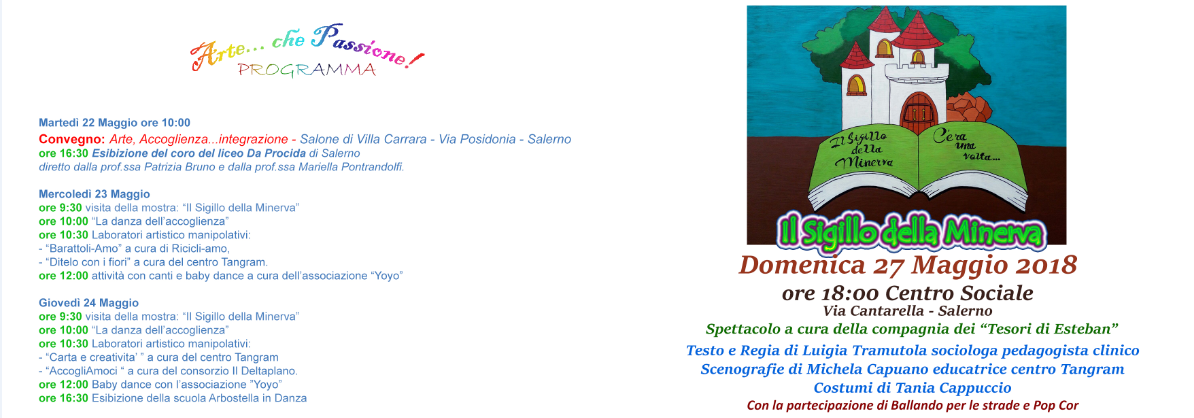 La manifestazione si concluderà il 27 maggio alle ore 18.00, presso il Centro Sociale di Salerno, con lo spettacolo “Il sigillo della Minerva”, interamente realizzato dagli ospiti e operatori del Centro Socio Educativo Tangram de Il Villaggio di Esteban.