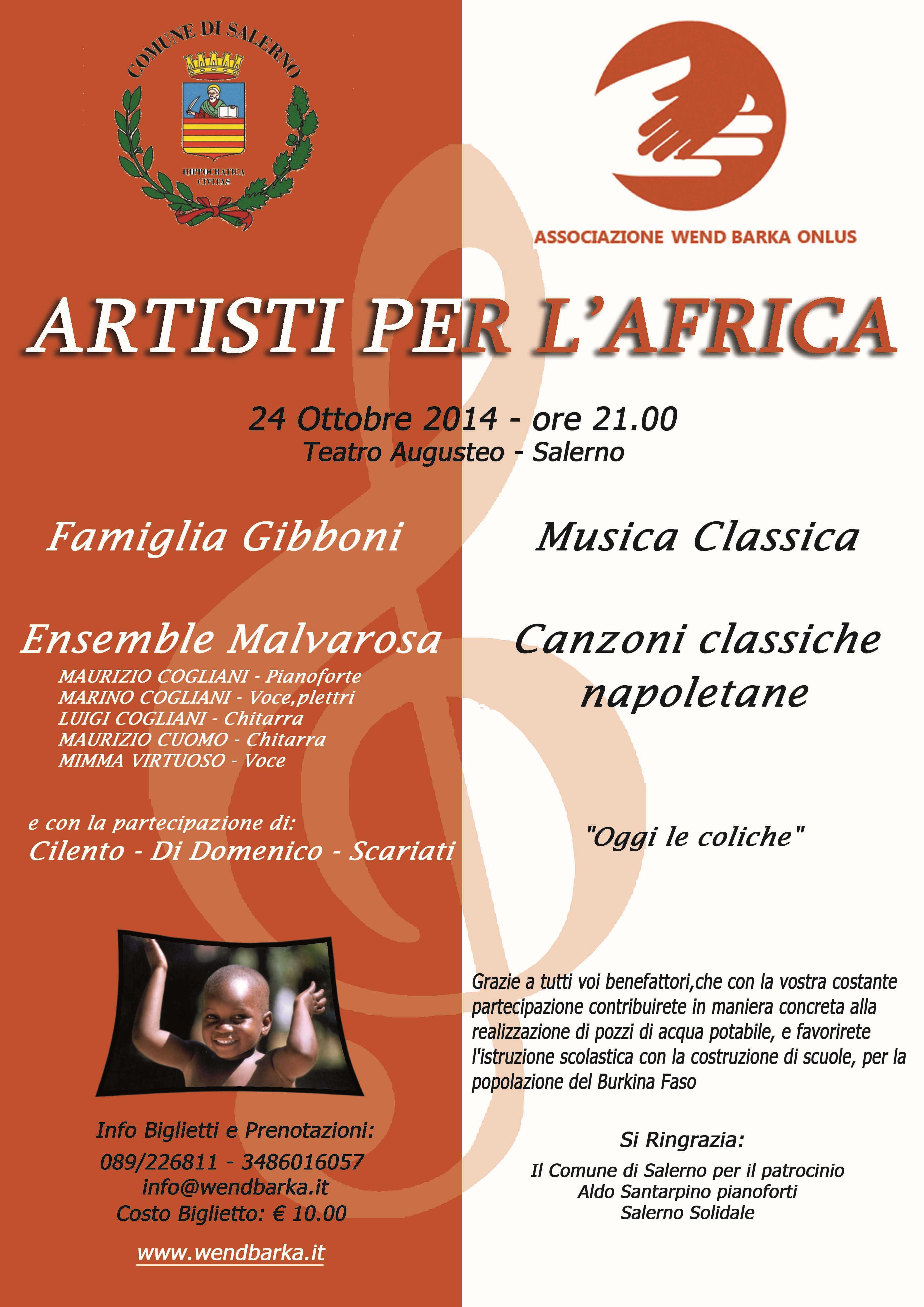 Venerdì 24 ottobre, alle ore 21.00, presso il Teatro Augusteo, si terrà il concerto di beneficenza "Artisti per l'Africa", organizzato dall'Associazione Wend Barka Onlus e patrocinato dal Comune di Salerno. In programma le esibizioni della "Famiglia Gibboni" e dell' "Ensemble Malvarosa".