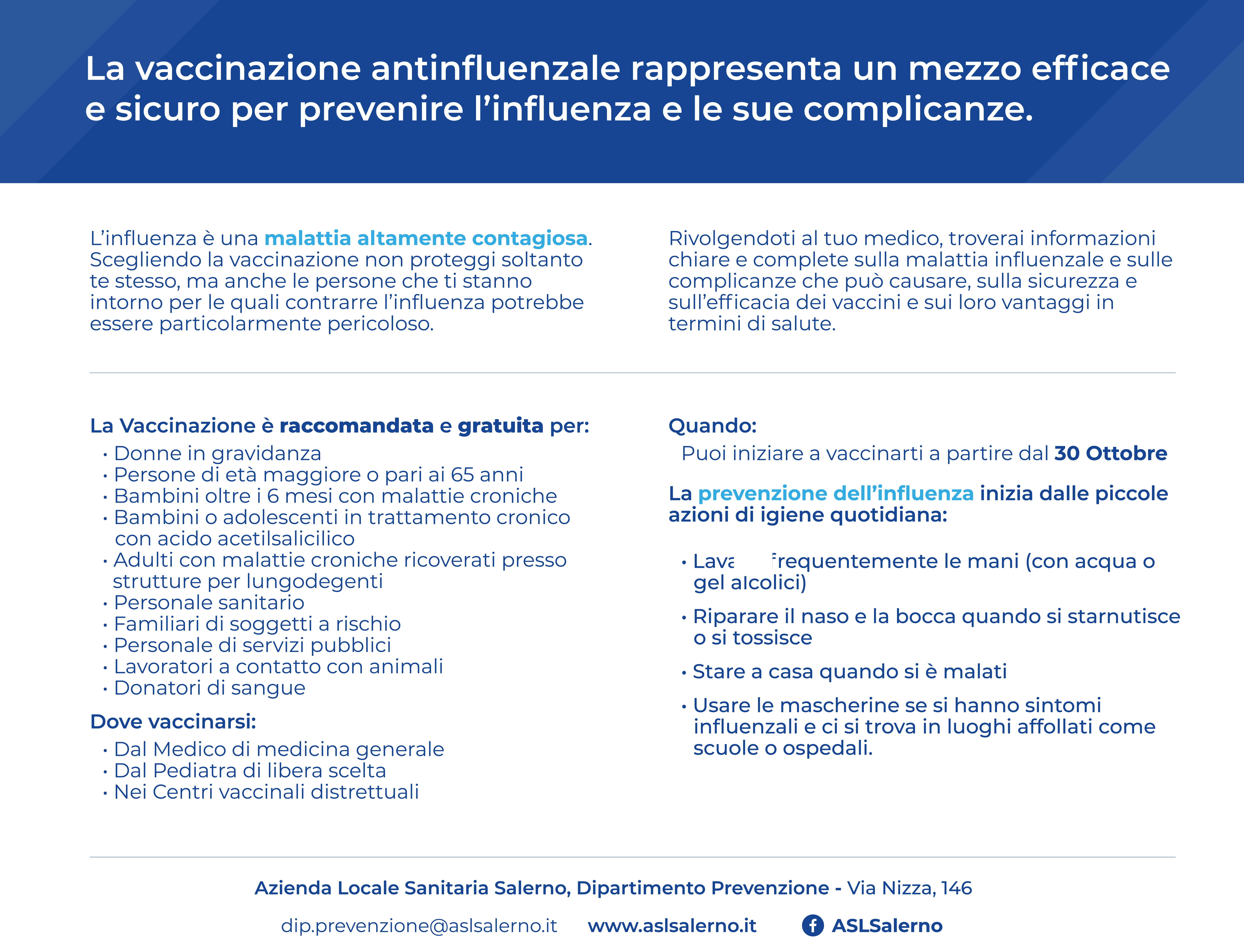 Dal 30 ottobre inizia la Campagna antinfluenzale 2019 dell'ASL Salerno.