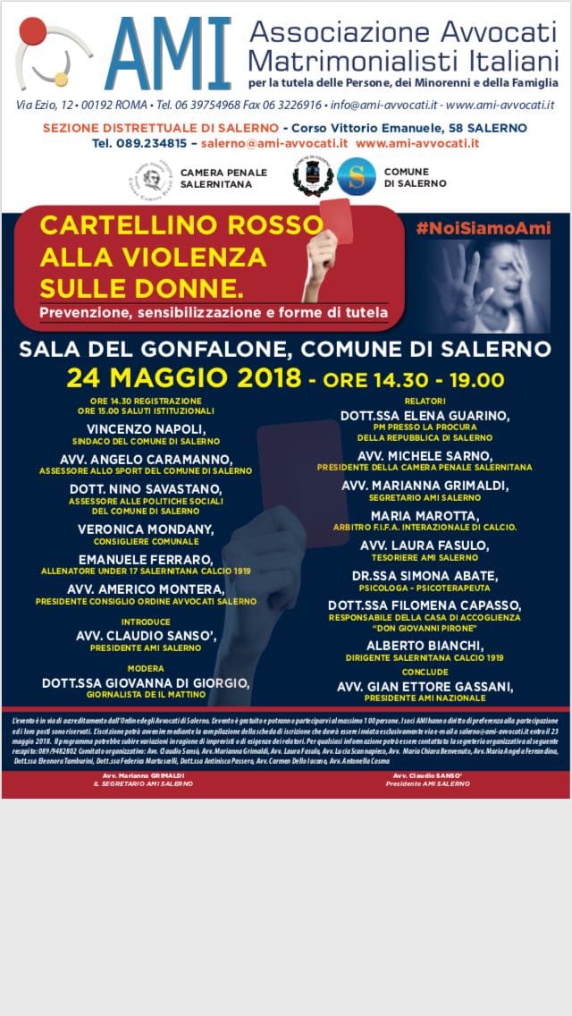 Giovedì 24 maggio, alle ore 15.00, presso la Sala del Gonfalone del Palazzo di Città, si terrà il convegno "Cartellino rosso alla violenza sulle donne. Prevenzione, sensibilizzazione e forme di tutela". L'incontro è organizzato dall'Associazione Avvocati Matrimonialisti Italiani ed è patrocinato dal Comune di Salerno.