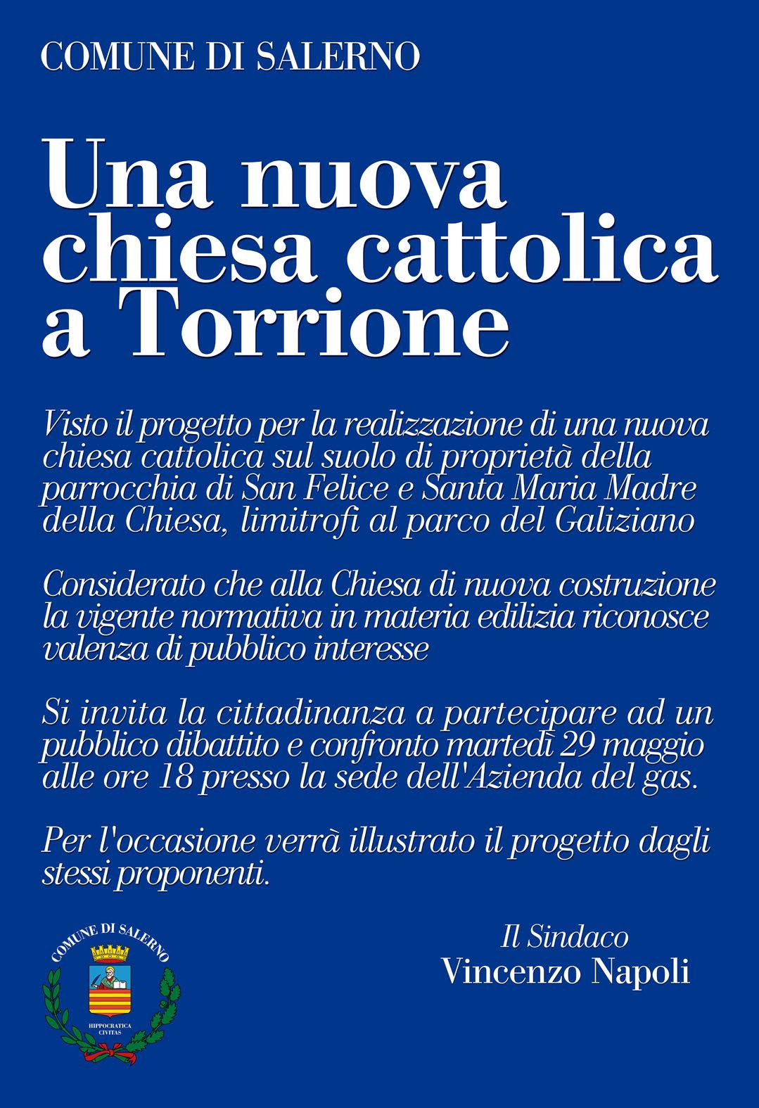 Il sindaco di Salerno Vincenzo Napoli, insieme al direttore dello Staff Alberto Di Lorenzo e all'assessore Mimmo De Maio, ieri sera, nella sede di Salerno Energia hanno incontrato i cittadini per discutere il progetto per la realizzazione di una nuova chiesa cattolica sul suolo di proprietà della parrocchia di San Felice e Santa Maria Madre della Chiesa, limitrofi al parco del Galiziano. La cittadinanza è stata invitata a partecipare ad un pubblico dibattito e confronto nel quale sono intervenuti gli stessi proponenti.