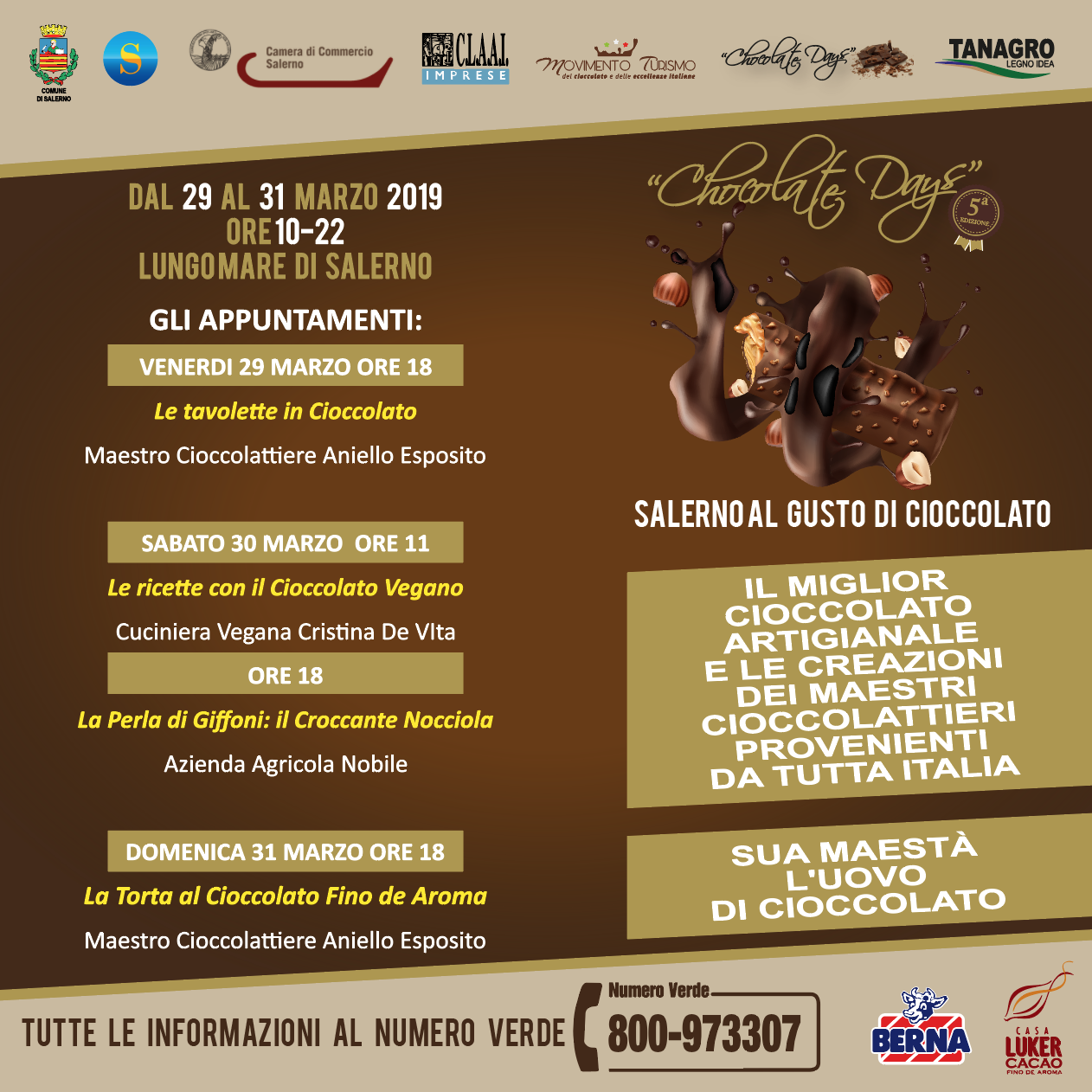 Il lungomare di Salerno è atteso da tre giorni di dolcezza che allieteranno i palati dei più golosi, dal 29 al 31 marzo prossimi. Organizzata da Claai Imprese, in collaborazione con Il Movimento Turismo del Cioccolato e delle Eccellenze Italiane e Tanagro legno Idea, con il patrocinio del Comune di Salerno e della Camera di Commercio di Salerno, la piu’ gettonata kermesse sul vero cioccolato italiano, che segna in città a Salerno la quinta edizione della Festa del Cioccolato Artigianale “Chocolate Days”, si propone di promuovere le proprietà benefiche del cioccolato artigianale rappresentando allo stesso tempo un’occasione unica per acquistare prodotti artigianali e sani non reperibili nella grande distribuzione.