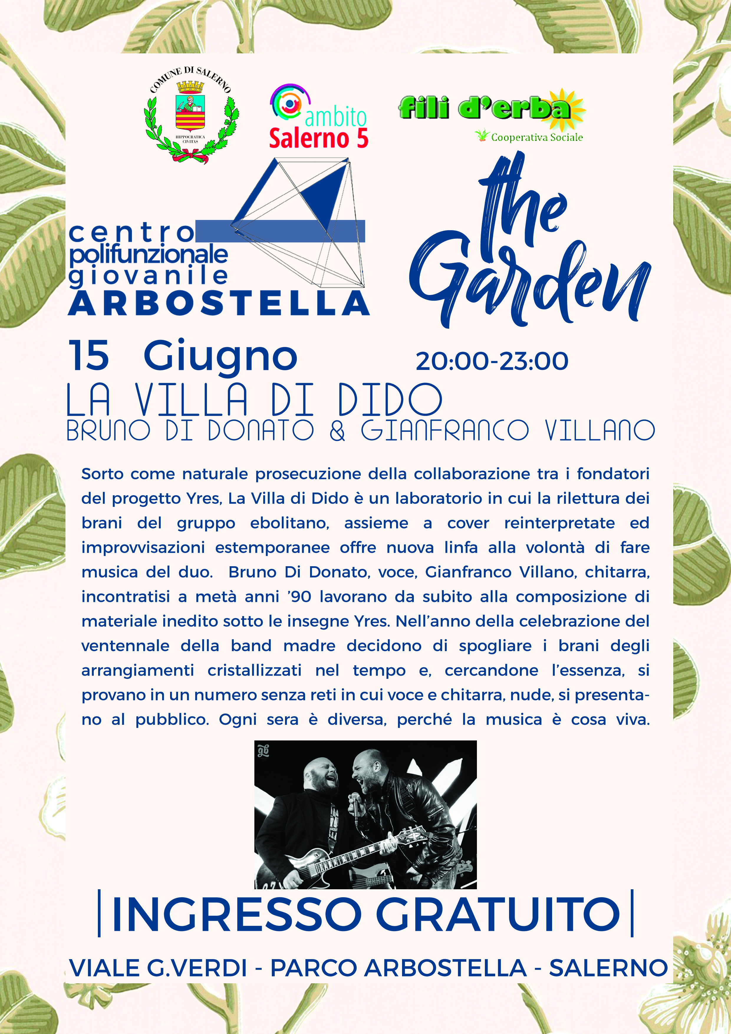 Giovedì 15 giugno, alle ore 20.00, si terra, presso il Centro Polifunzionale Giovanile Arbostella, il secondo concerto della rassegna musicale “The Garden” con il duo acustico “La Villa di Dido”.