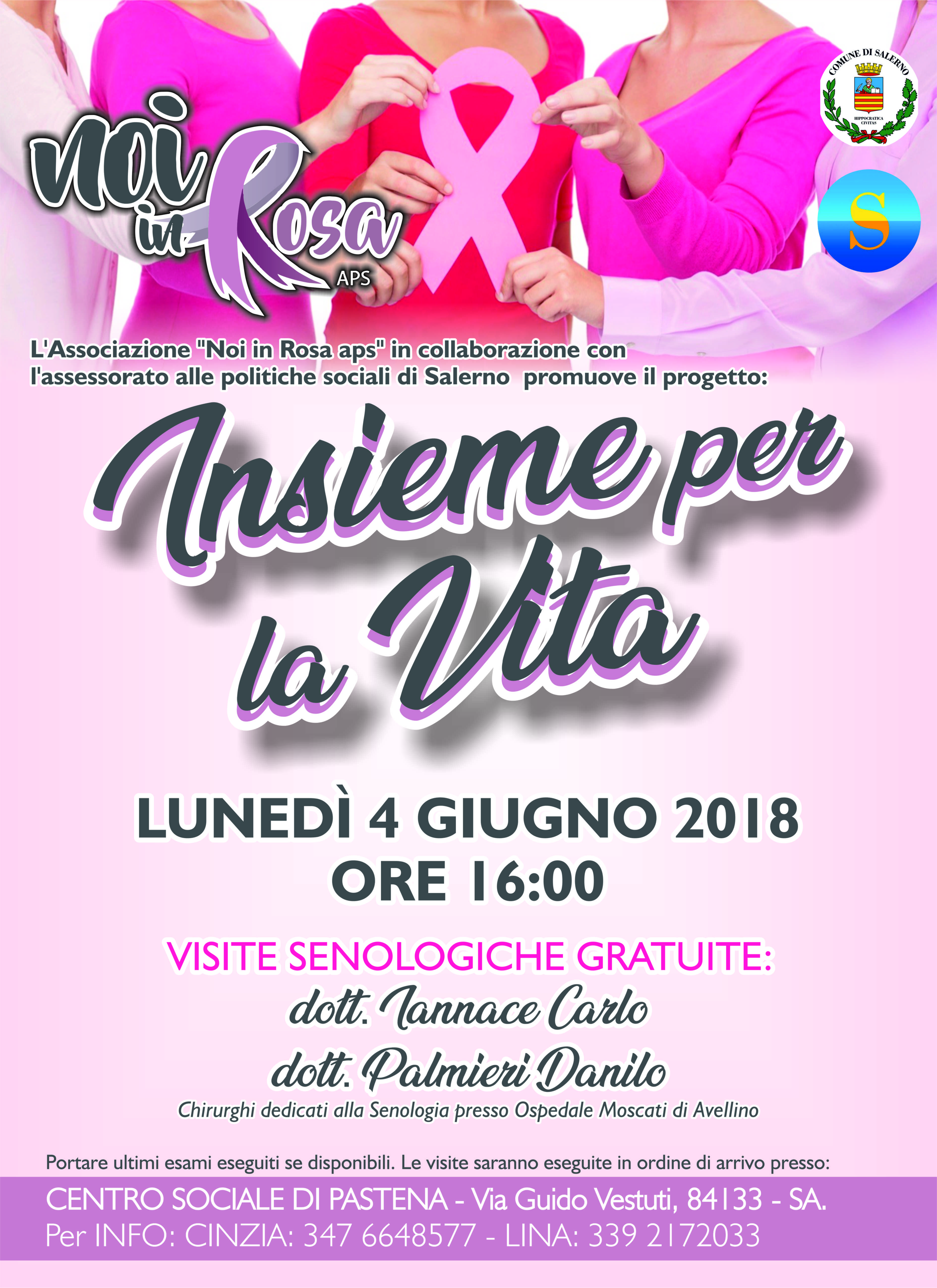 Lunedì 4 giugno alle ore 16 l’associazione Noi in Rosa, in collaborazione con l’assessorato alle Politiche Sociali del Comune di Salerno ha organizzato i controlli senologici gratuiti presso il Centro Sociale di Pastena (via Guido Vestuti). Le visite saranno eseguite dai dottori Carlo Iannace e Danilo Palmieri – Chirurghi dedicati alla Senologia all’Ospedale Moscati di Avellino.