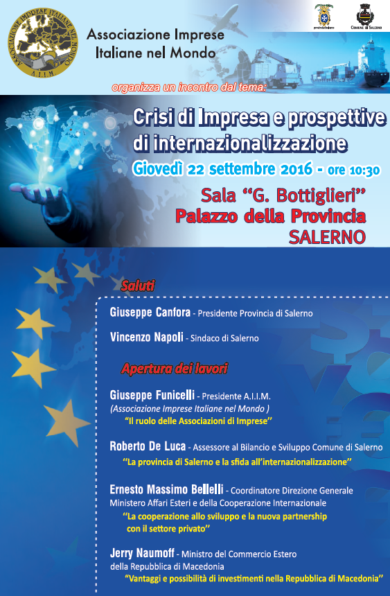 Il Sindaco di Salerno Vincenzo Napoli e l'Assessore comunale al Bilancio e Sviluppo Roberto De Luca parteciperanno giovedì 22 settembre, alle ore ore 10.30, presso il Salone G. Bottiglieri del Palazzo della Provincia, al convegno dal tema "Crisi di impresa e prospettive di internazionalizzazione". All'incontro parteciperà tra gli altri il Ministro del Commercio Estero della Macedonia Jerry Naumoff.