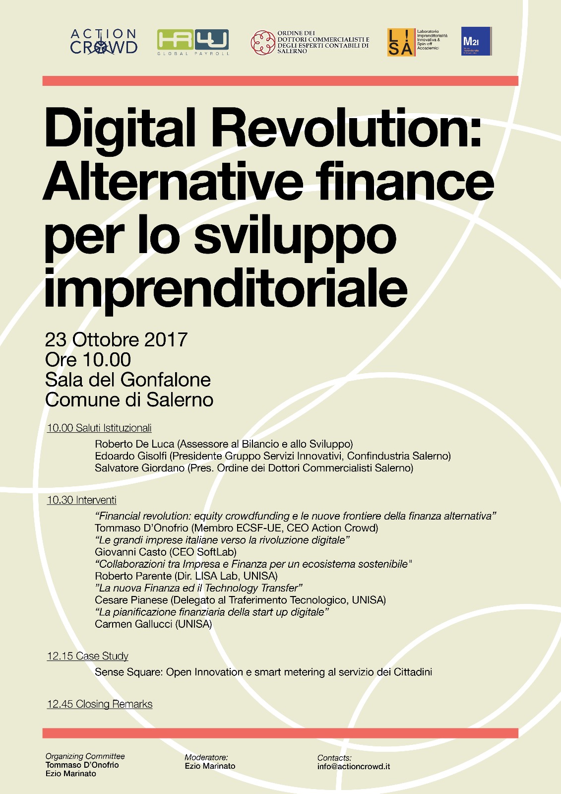 Lunedì 23 ottobre, alle ore 10.00, presso la Sala del Gonfalone del Palazzo di Città, alla presenza dell'Assessore al Bilancio e allo Sviluppo Roberto De Luca, si terrà il convegno “Digital Revolution: Alternative Finance per lo sviluppo imprenditoriale”.