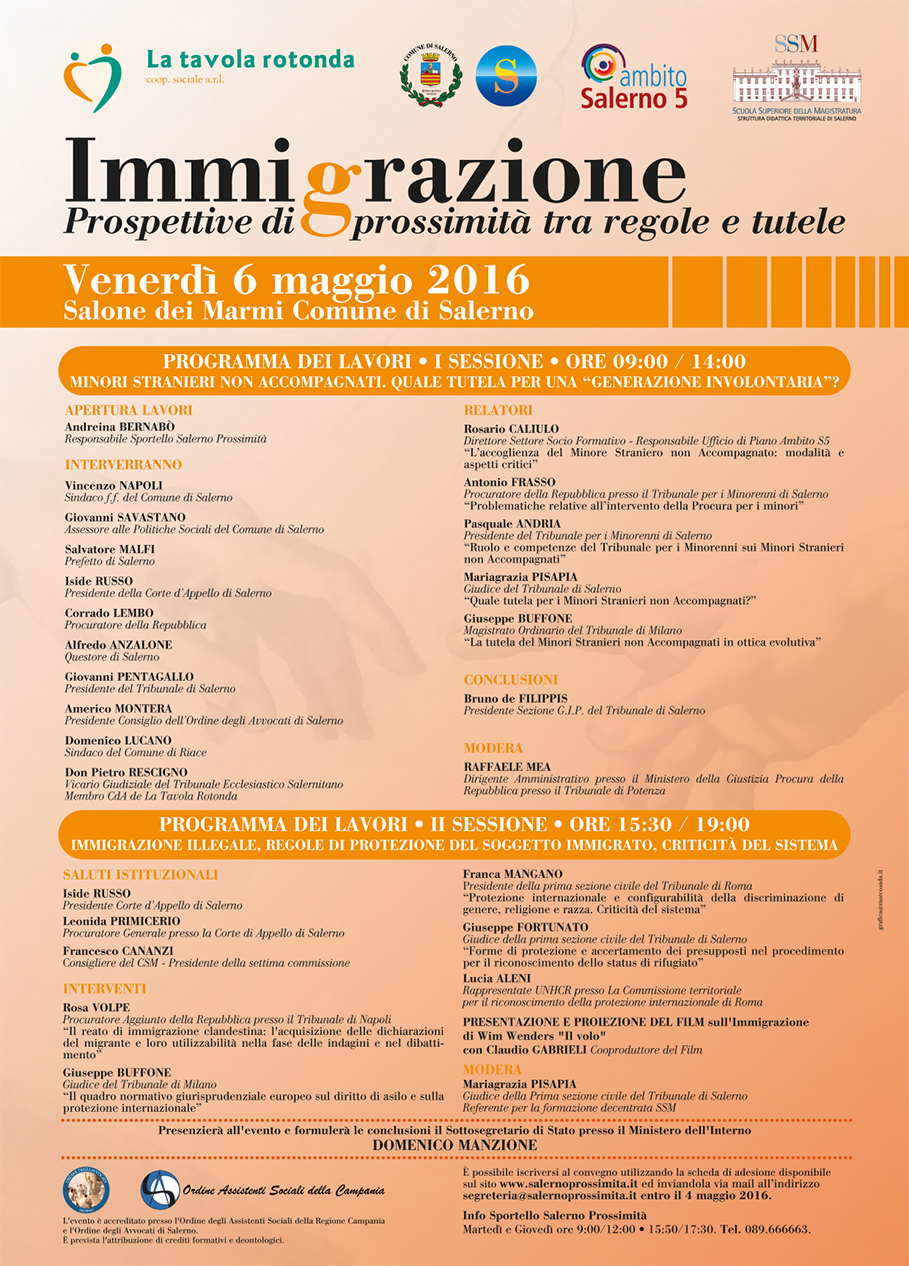 L’evento si strutturerà in due sessioni: la mattina dalle ore 9:00 alle 14:00 dedicata ai Minori Stranieri non Accompagnati e il pomeriggio dalle 15:30 alle 19:00 riguarderà la questione più ampia relativa alla immigrazione illegale. La giornata formativa si rivolge ad avvocati, praticanti avvocati, assistenti sociali, magistrati, responsabili di comunità e centri di accoglienza, operatori del settore e cittadini interessati per sensibilità e competenza. Il Convegno è accreditato presso l’Ordine degli Avvocati di Salerno, presso la Scuola Superiore della Magistratura e presso l’Ordine degli Assistenti Sociali della Regione Campania.