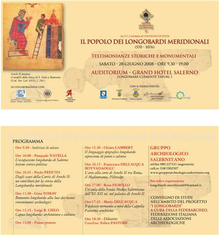 L’idea di organizzare un convegno di studi nella città di Salerno dal titolo Il popolo dei Longobardi meridionali nasce nell’ambito delle iniziative promosse dal progetto “I Longobardi“, a cura della Federarcheo (Federazione Italiana delle Associazioni Archeologiche), a cui il Gruppo Archeologico Salernitano partecipa.