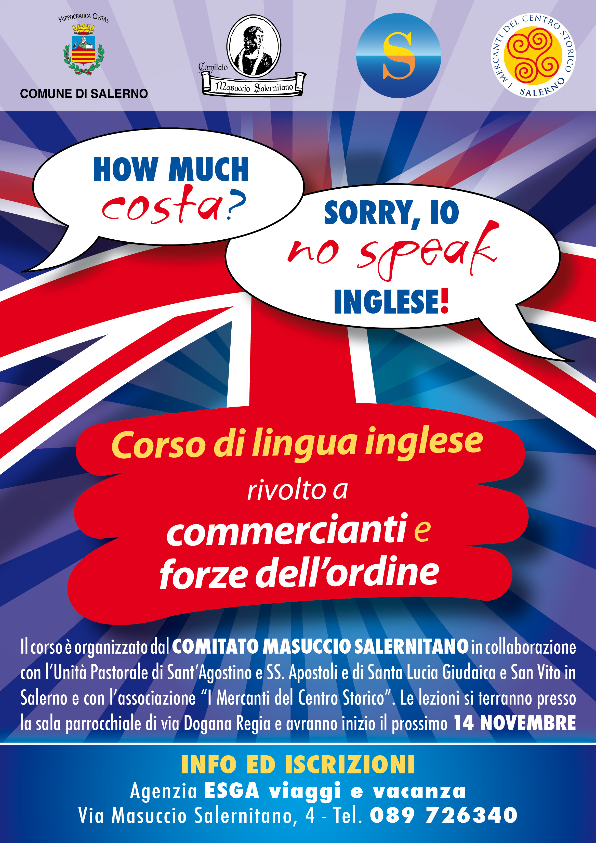 Prenderà il via il prossimo 14 novembre il primo corso d’inglese con finalità turistica rivolto a commercianti e forze dell’ordine. Ad annunciarlo è la neo eletta presidente, dottoressa Francesca Guzzo. Il corso organizzato dal “Comitato Masuccio Salernitano” - in accordo il Rev.do Sac. Felice Moliterno Parroco dell'Unità Pastorale di S.Agostino e SS. Apostoli e di S. Lucia Giudaica e San Vito in Salerno e con il presidente de “I Mercanti del Centro Storico”, signor Antonio Ventre – nasce dall’esigenza del grande mutamento della città di Salerno in ambito turistico ed ha il preciso scopo di migliorare la conoscenza linguistica e per trarne profitto in ambito professionale quando ci si interfaccia con l'utenza straniera, il tutto con il patrocinio del Comune di Salerno.