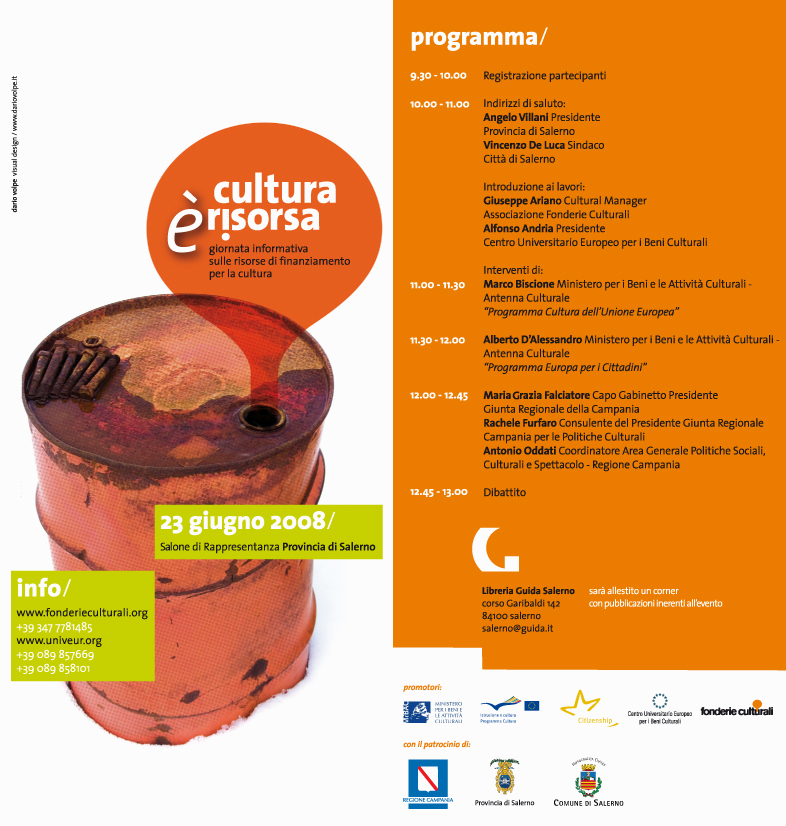 Lunedì 23 giugno p.v., a partire dalle 9.30, a Salerno presso il Salone di Rappresentanza di Palazzo Sant’Agostino, si svolgerà l’incontro "Cultura è Risorsa" dedicato alla progettazione in ambito culturale.