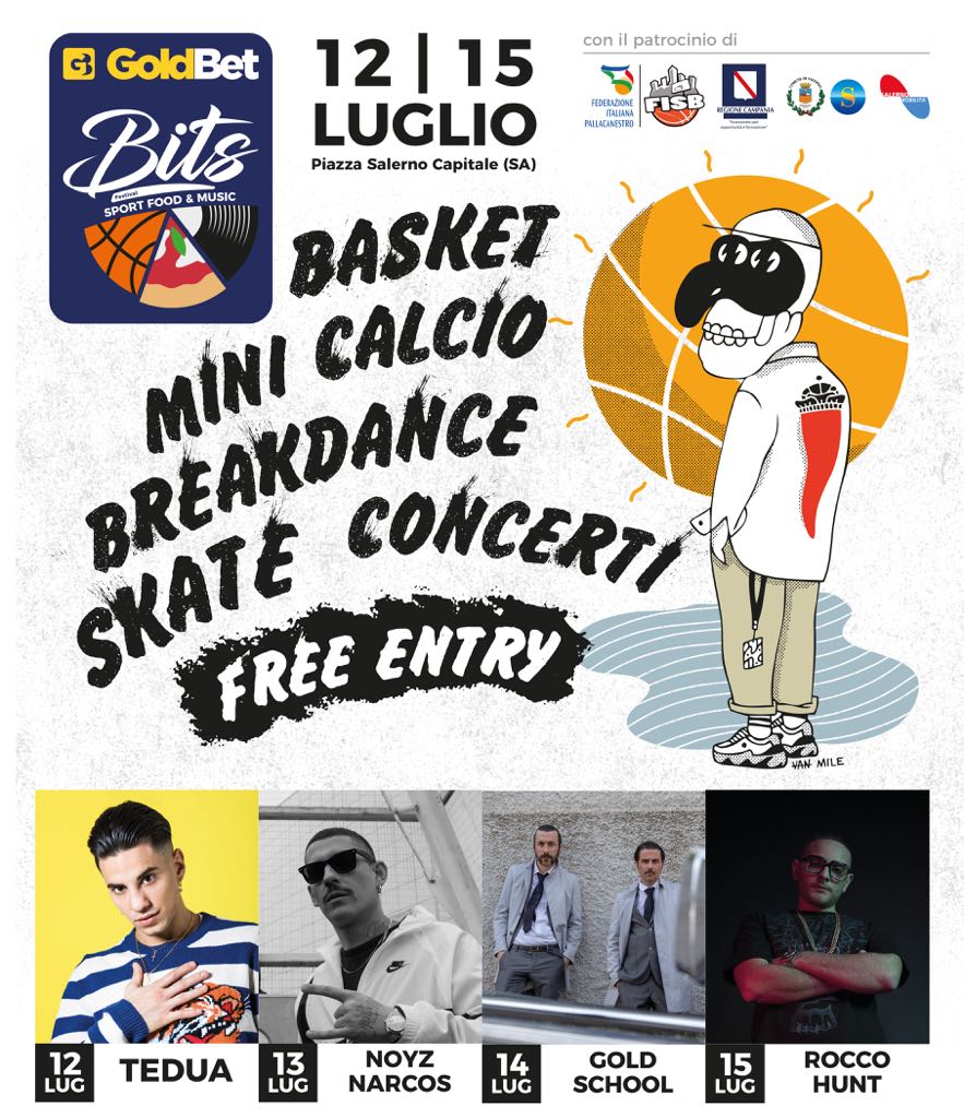 Con una formula consolidata, ma ricca di tante novità, ritorna il GoldBetBITS Festival, in programma dal 12 al 15 luglio, nella cornice di Piazza Salerno Capitale: il primo Street Festival 100% gratuitoche, con la sua offerta diSport, Food, Music,dà la possibilità di divertirsi, partecipando a numerose attività sportive, musicali e artistiche. Giunta alla VI edizione, la manifestazione è organizzata dall’Associazione BITS Onlus, col patrocinio del Comune di Salerno, in collaborazione con la Regione Campania - Assessorato alle Pari Opportunità e Formazione. Considerato un vero e proprio villaggio aperto, dove dare libero sfogo alle arti di strada, e non solo, il festival è diventato un appuntamento imperdibile, nella rassegna di eventi estivi a Salerno, con un calendario pieno di iniziative per tutti i gusti.