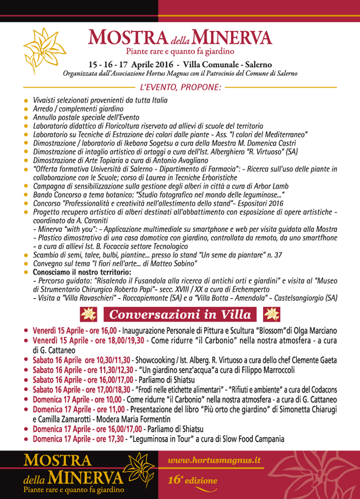 Venerdì 15 aprile il Sindaco ff di Salerno Vincenzo Napoli ha inaugurato la 16ª edizione della Mostra della Minerva, tradizionale appuntamento florovivaistico della primavera salernitana in programma fino a domenica 17 aprile.