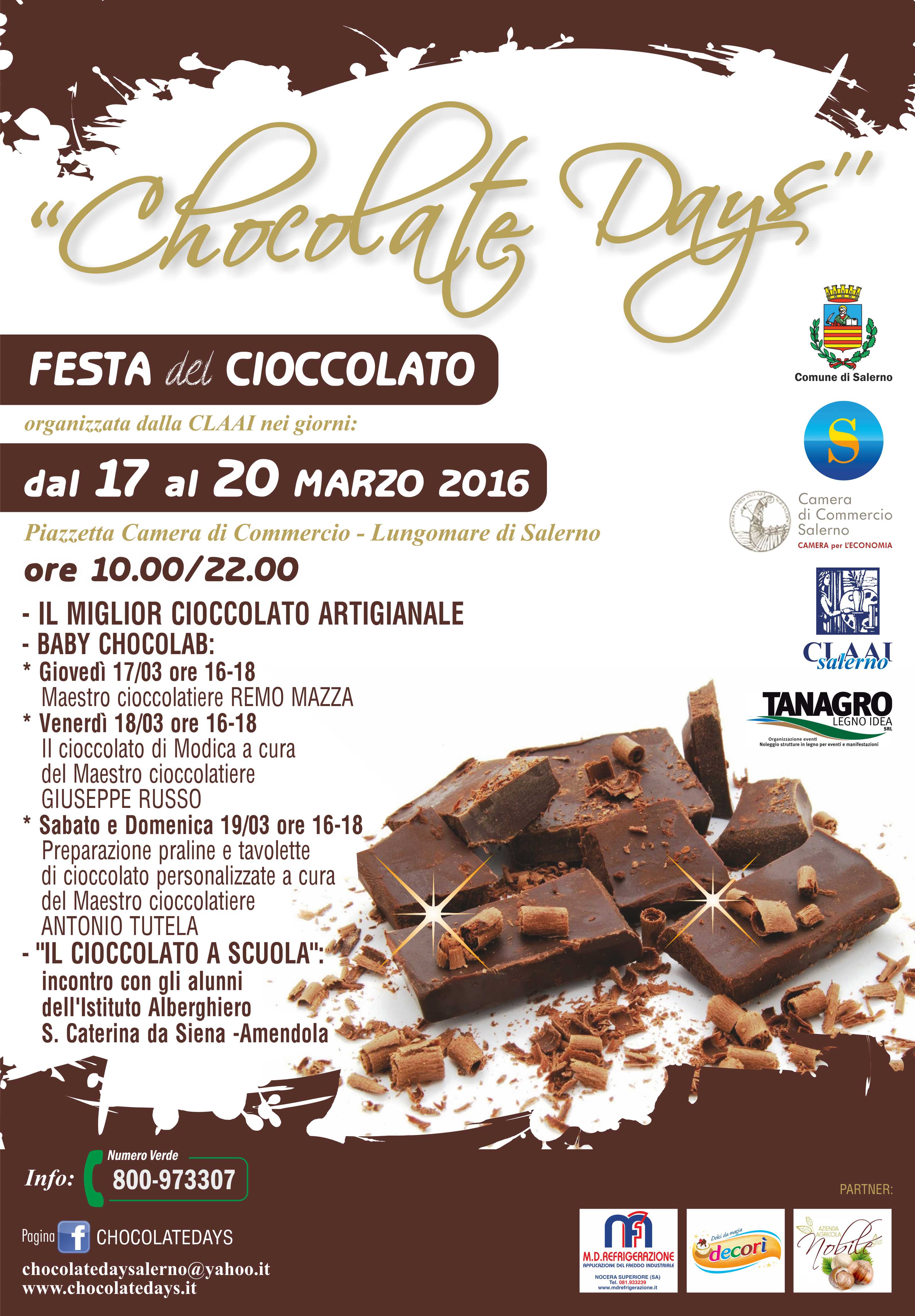 Tutto pronto per la seconda edizione del “Chocolate days - Festa del Cioccolato”, l'iniziativa promossa e organizzata dalla C.l.a.a.i - Unione artigiani piccole e medie imprese della provincia di Salerno - , in collaborazione con Tanagro Legno Idea e con il patrocinio del Comune di Salernoo e della Camera di Commercio di Salerno. Un appuntamento che si conferma per il secondo anno consecutivo e che si terrà dal 17 al 20 Marzo - dalle 10 alle 22 - nella piazzetta Camera di Commercio sul Lungomare di Salerno.