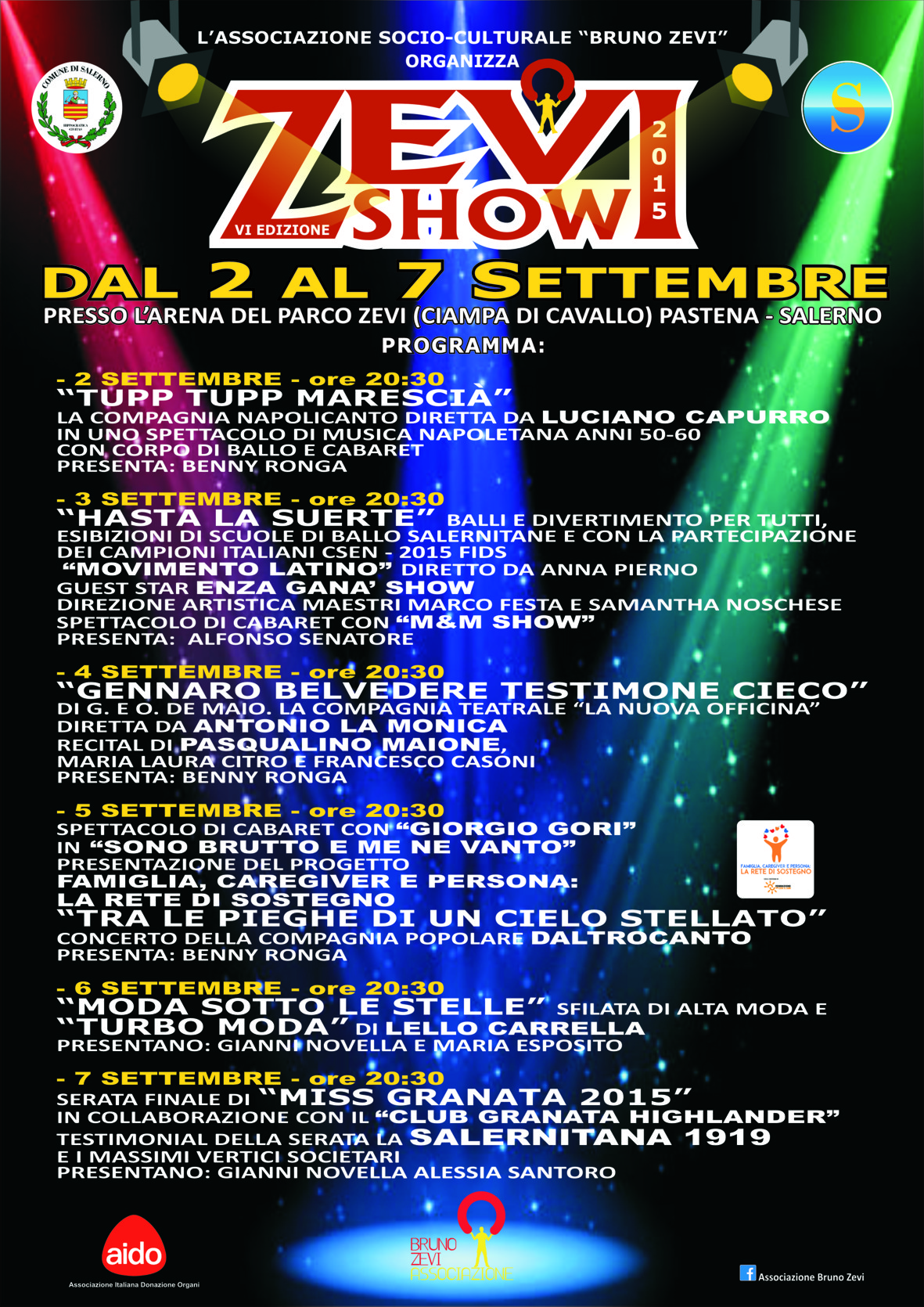 Si terrà dal 2 al 7 settembre la VI edizione di "Zevi Show", rassegna di musica, teatro, ballo e moda che animerà le serate di fine estate al rione Zevi. Dopo le prime serate dedicate al canto, al ballo, al cabaret, gli ultimi due appuntamenti saranno all'insegna della moda e della bellezza. Il 7 settembre la rassegna si chiuderà con la serata finale di "Miss Granata 2015", alla quale prenderanno parte i giocatori e i vertici societari della Salernitana.