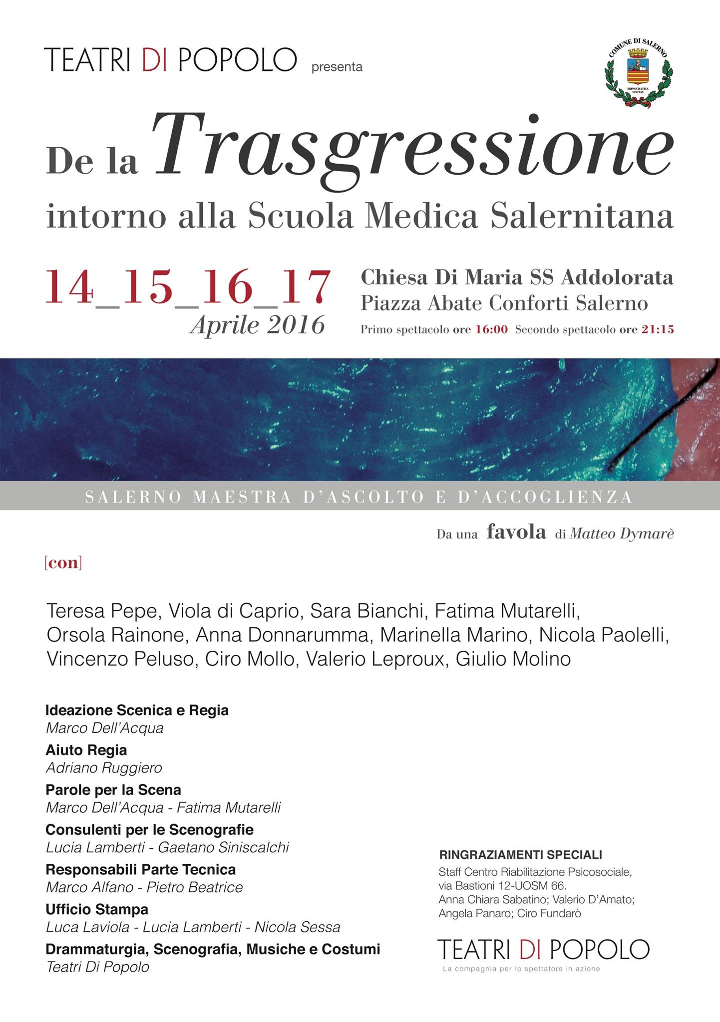 Con l'apporto cruciale dei pazienti del centro di salute mentale di via Bastioni lo spettacolo 'De la Trasgressione' dal 14 al 17 aprile nella Chiesa di Maria Santissima Addolorata, sempre nel centro di Salerno. Una messa in scena per vedere come eravamo e come ancora possiamo essere. Come nello slogan di Teatri di Popolo, "la compagnia per lo spettatore in azione".