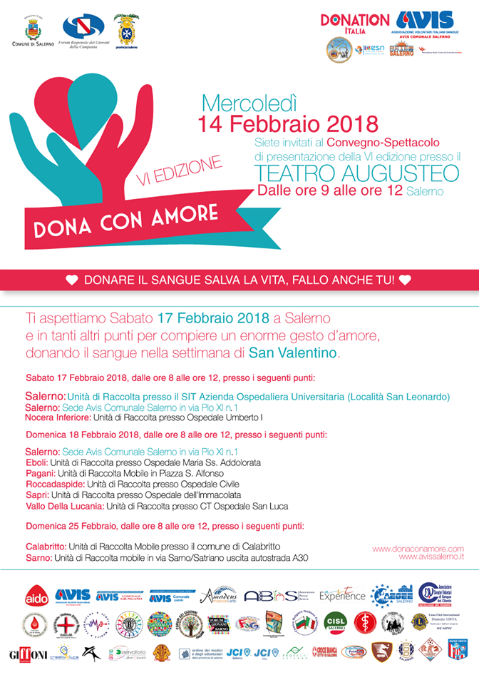 Le Associazioni “DONATION Italia”, “l’Avis Comunale di Salerno”, “Rete dei Giovani per Salerno”, “ESN Salerno Erasmus Student Network”, “Fondazione Comunità Salernitana ONLUS” e il “Forum Regionale dei Giovani della Campania”, con la partecipazione della Regione Campania, Provincia di Salerno, Comune di Salerno e dell’Azienda Ospedaliera Universitaria San Giovanni di Dio Ruggì d'Aragona di Salerno, invitano all’evento nazionale ed internazionale di promozione sociale, dedicato alla sensibilizzazione, donazione del sangue e all’integrazione socio-culturale (grazie alla numerosa presenza di studenti stranieri del progetto erasmus) intitolato “DONA CON AMORE”.