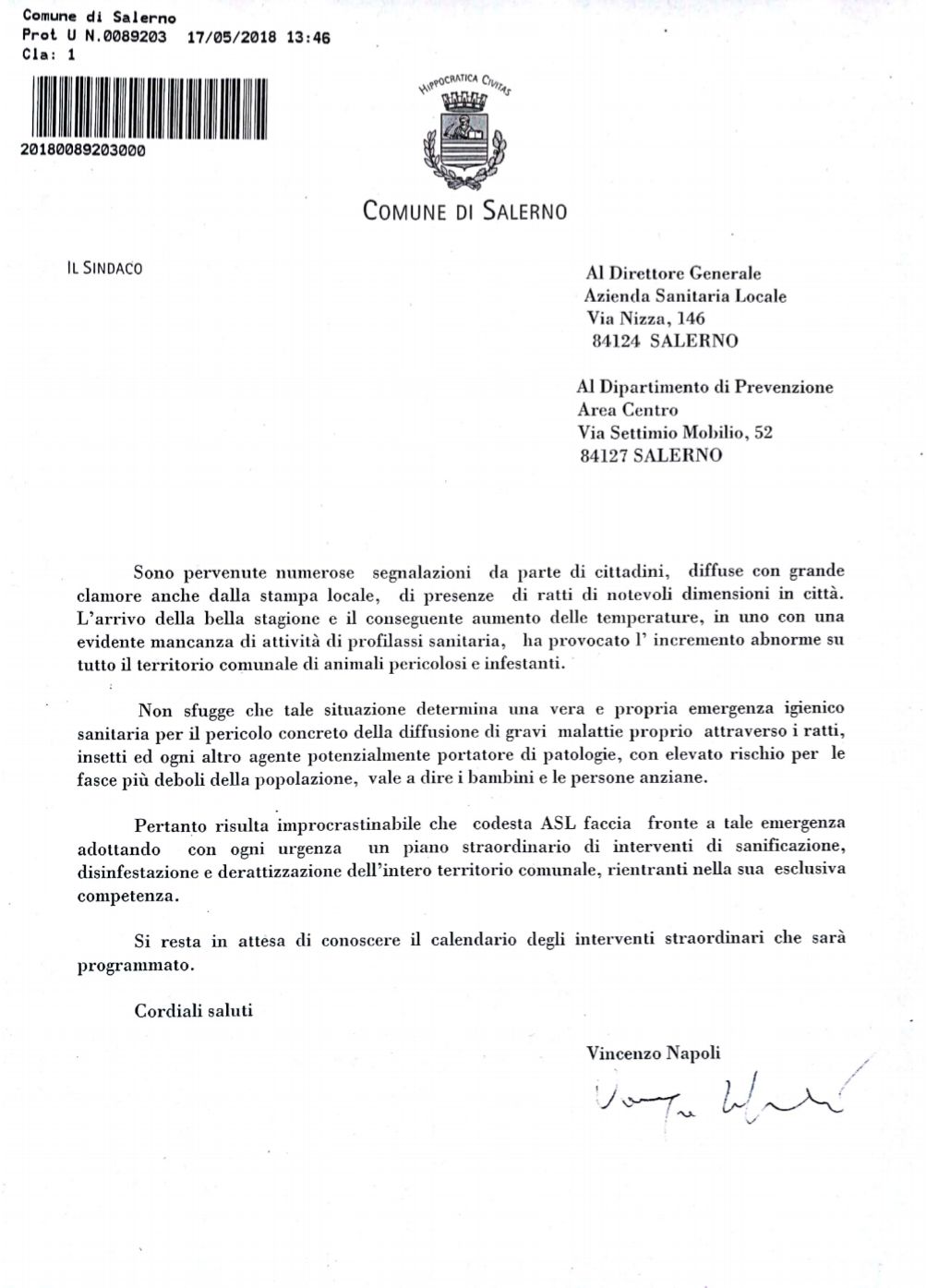 Emergenza ratti, il sindaco di Salerno Vincenzo Napoli scrive alla Asl per richiedere interventi urgenti di sanificazione, disinfestazione e derattizzazione.