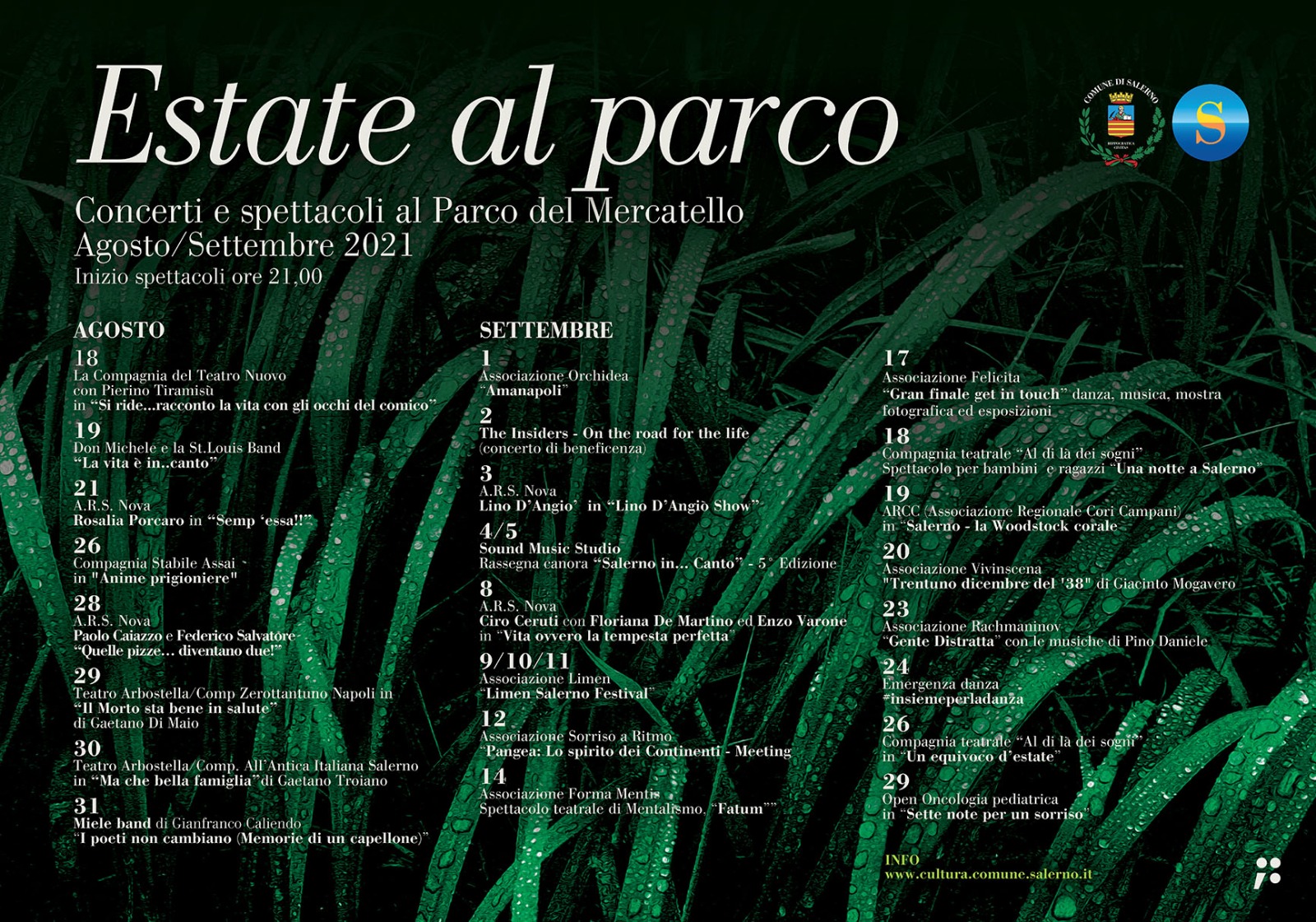 Musica, teatro, danza, solidarietà, spettacoli per i più piccoli: un fitto calendario di eventi animerà le serate di agosto e settembre al Parco del Mercatello. "Estate al Parco" è la rassegna promossa dal Comune di Salerno che, con il nuovo allestimento all'interno del più esteso polmone verde della città, ha voluto incrementare le strutture e le opportunità per lo svolgimento di spettacoli e manifestazioni nel corso della stagione estiva, con l'intento di offrire ad artisti, addetti ai lavori, organizzatori un aiuto concreto in questa fase storica di ripartenza dopo la pandemia Covid-19 che ha danneggiato in particolar modo l’attività artistica e culturale.