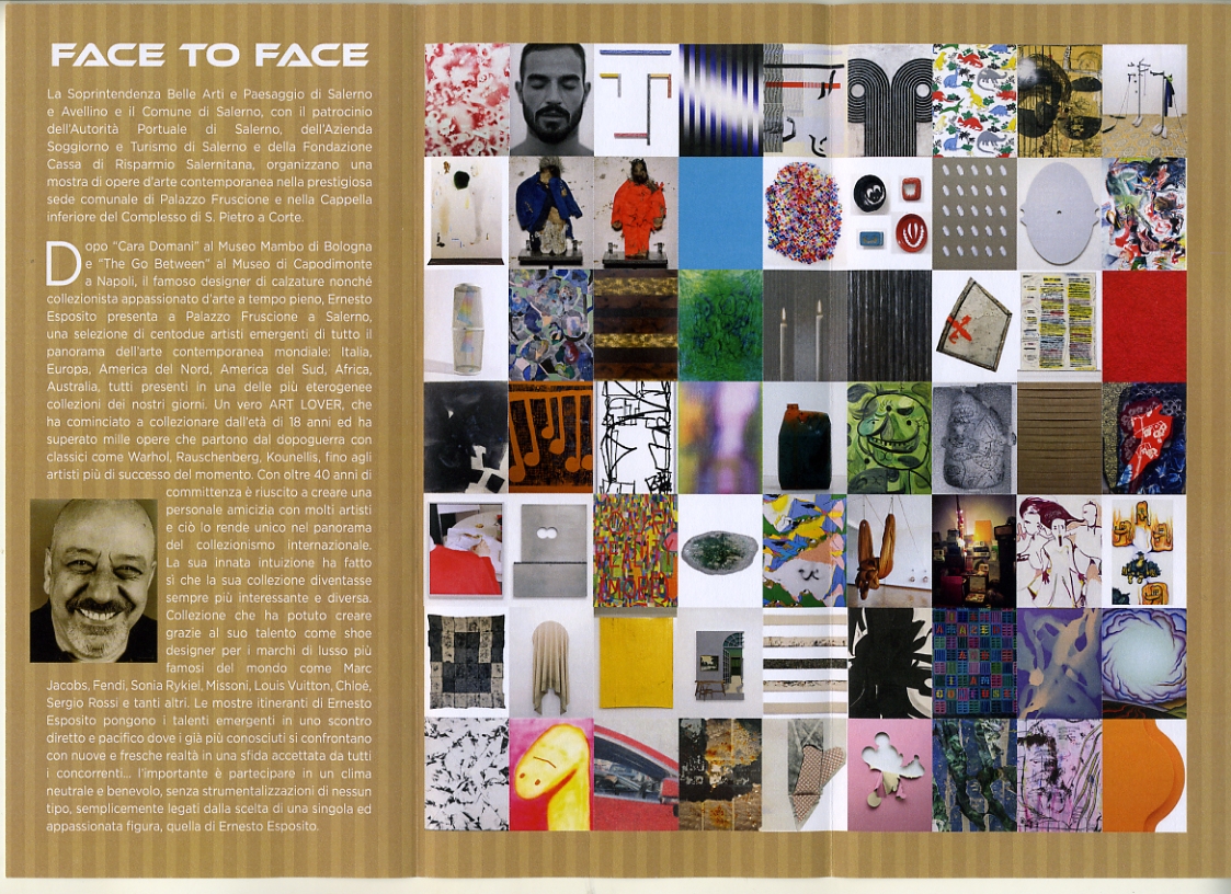 Martedì 22 marzo 2016 alle ore 18, a Salerno, presso le sale espositive di Palazzo “Fruscione” e il complesso monumentale di San Pietro a Corte, sarà inaugurata la mostra di arte contemporanea dal titolo “Face to Face”. L’iniziativa è organizzata dalla Soprintendenza Belle Arti e Paesaggio di Salerno e Avellino, dal Comune di Salerno, con il Patrocinio dell’Autorità Portuale di Salerno, Azienda Soggiorno e Turismo di Salerno e della Fondazione Cassa di Risparmio Salernitana