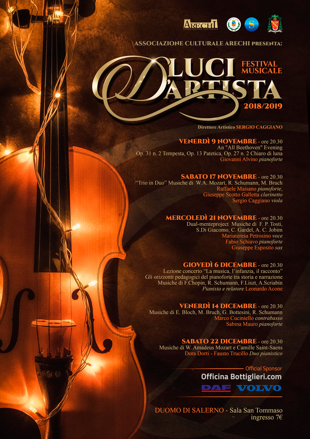 Venerdì 9 novembre 2018, alle ore 20.15, in occasione dell'inaugurazione di Luci d'artista 20018/2019, al quadriportico del Duomo di Salerno, nella sala San Tommaso, si terrà la prima serata del festival musicale “Luci d’artista”, organizzato dall’Associazione Culturale Arechi, guidata dal violista salernitano Sergio Caggiano. Il concerto prevede un programma da grande virtuoso della tastiera, sotto il titolo di “An All Beethoven Evening”, tutto dedicato al compositore Ludwig Van Beethoven, filosofo delle note, con tre Sonate per pianoforte, tra le più celebri: Op. 31 n. 2 (n. 17) “La Tempesta, Op. 13 (n. 8) “La Patetica, Op. 27 n. 2 (n. 14) “Al Chiaro di Luna”. È previsto un ingresso di 7 euro a persona. Esegue il M.ro Giovanni Alvino.