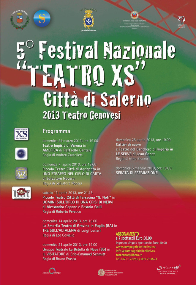 Partirà domenica 24 marzo la V edizione del Festival Nazionale "Teatro XS" Città di Salerno in programma al Teatro Genovesi. Il primo appuntamento vedrà in scena il Teatro Impiria di Verona in "America" di Raffaello Canteri.