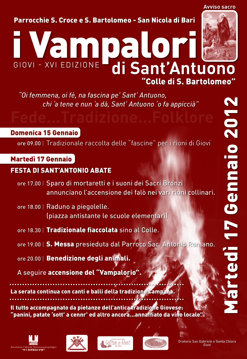 Martedì 17 gennaio la parrocchia di Giovi S.Croce e S.Bartolomeo - San Nicola di Bari, con la collaborazione dell' Oratorio San Gabriele e Santa Chiara,e dalle associazioni "I Castellani", "Jovis", "Colline di Giovi" e "Amicus", si riunisce per la tradizionale festa di Sant'Antonio Abate, che avrà il suo momento clou con l'evento plurisecolare dei "Vampalori", una tradizione che riunisce fede e folklore. Prima dell'attesa accensione del falò, il programma della manifestazione, giunta alla sua XVI edizione, prevede le fiaccolate per le vie del borgo e la benedizione degli animali.