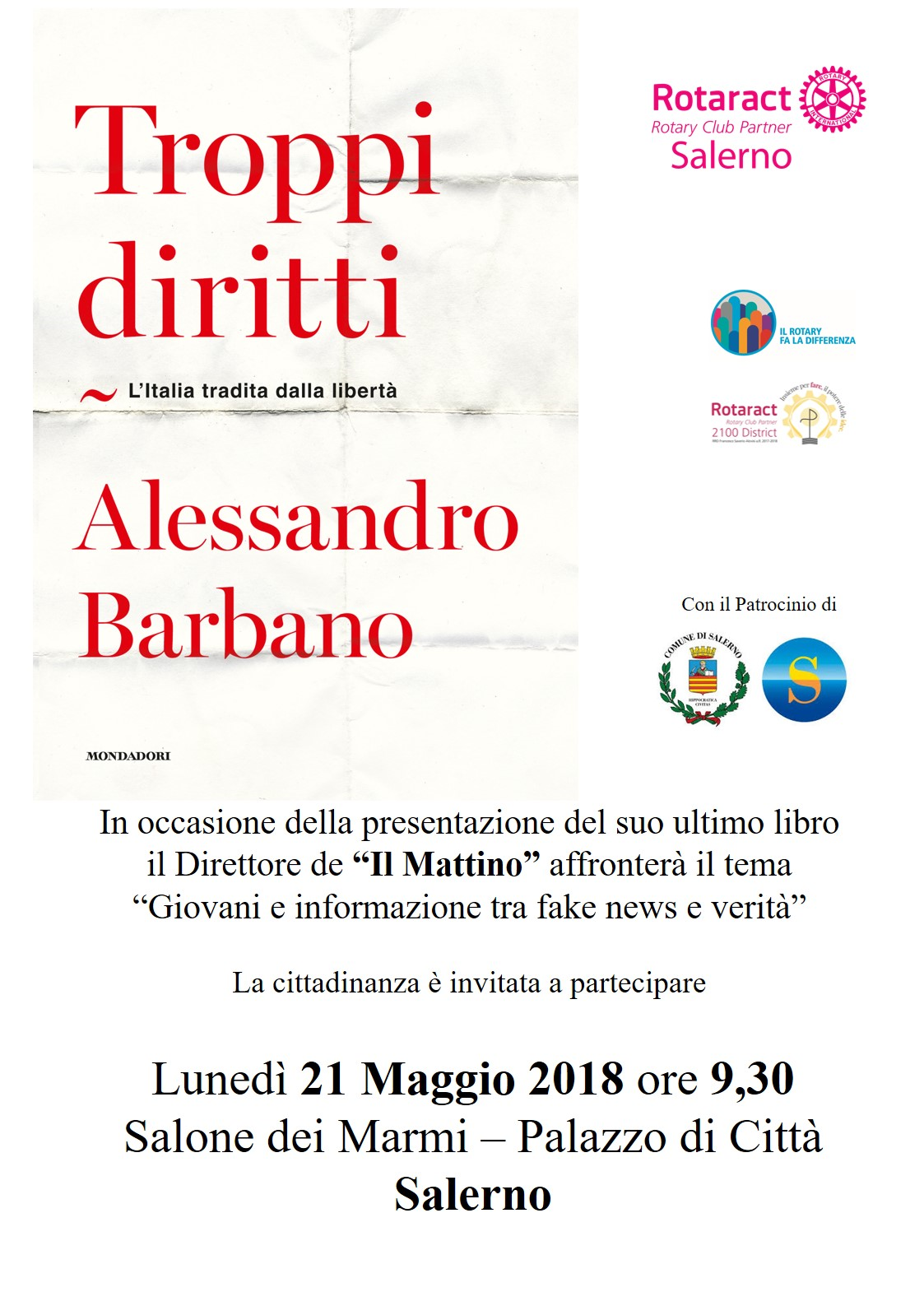 Lunedì 21 maggio alle ore 9.30 nel Salone dei Marmi del Comune di Salerno, il Rotaract Club Salerno ospiterà il direttore de “Il Mattino” Alessandro Barbano che presenterà il suo ultimo libro: “Troppi diritti. L’Italia tradita dalla libertà”.