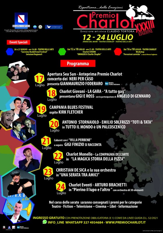Musica, teatro, cinema, libri e soprattutto giovani cabarettisti emergenti. Sono questi gli ingredienti dell’edizione 2021 del Premio Charlot, la kermesse dedicata al più grande attore di tutti i tempi, giunta alla sua XXXIII edizione. Presentato questa mattina, nel Salone dei Marmi, del Comune di Salerno, dal direttore artistico Claudio Tortora, alla presenza del sindaco Vincenzo Napoli e del presidente dell’autorità portuale Andrea Annunziata, il programma completo degli appuntamenti. Il via domani 26 giugno, al Teatro delle Arti, con la due giorni dedicata alle selezioni per Sanremo Rock&Trend Festival.