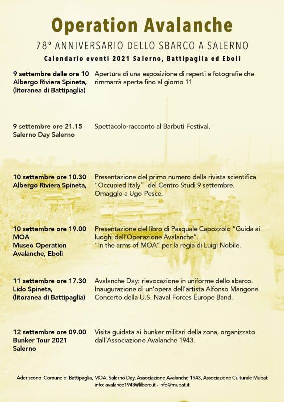 Il 10 e l’11 settembre sarà il momento di “Avalanche Day”, rassegna curata dall’Associazione Mubat con l’amministrazione comunale di Battipaglia, sul litorale dello sbarco, in località Spineta. Il 10 avrà luogo, alle 10:30, la presentazione della rivista scientifica “Occupied Italy”; l’11 si svolgerà la tradizionale rievocazione in costume dello sbarco alleato, a partire dalle 17:30, con a seguire concerto della U.S. Naval Forces Europe Band.