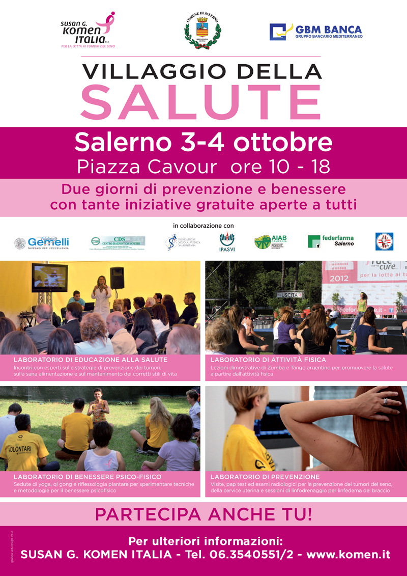 Grazie al sostegno che un prestigioso partner come GBM Banca fornirà in questa tappa (e nelle successive in programma nel 2013 ad Andria, Roma e Bari), mercoledì 3 e giovedì 4 ottobre a Salerno, in Piazza Cavour si terrà la I edizione del “Villaggio della Salute”, due giorni dedicati alla prevenzione e al benessere, realizzati con il patrocinio del Comune di Salerno.