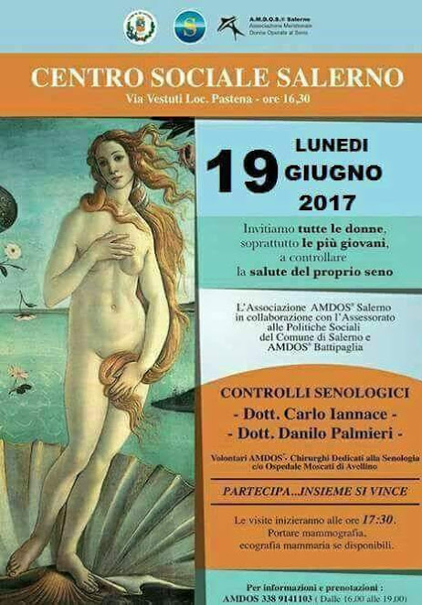 Al Centro Sociale di Salerno, lunedì 19 giugno a partire dalle ore 16.30, l'associazione Amdos Salerno, in collaborazione con l’assessorato alle Politiche Sociali del Comune di Salerno e Amdos Battipaglia, hanno organizzato controlli senologici per le signore e le giovani donne che intendono effettuare una visita.