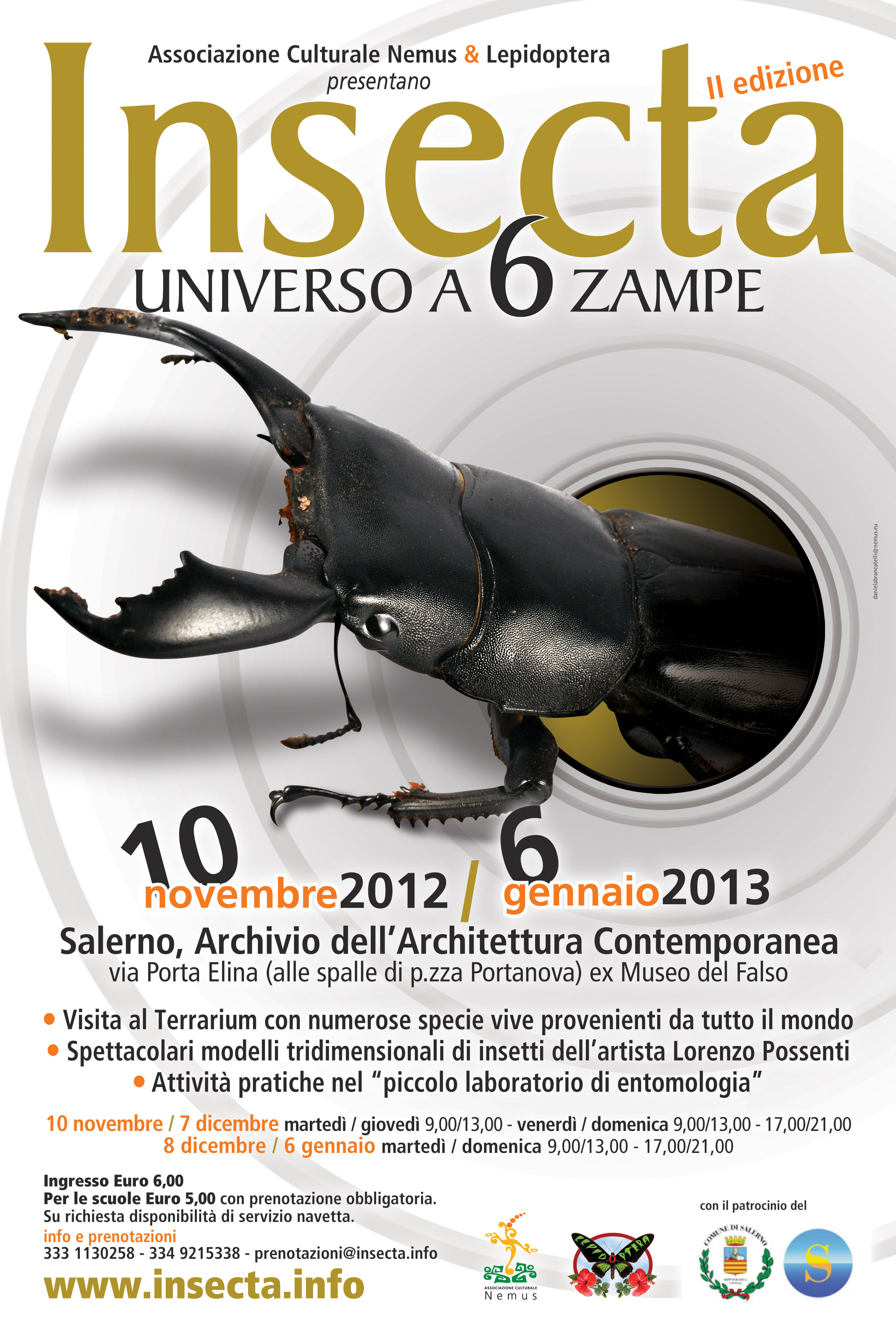 Dopo la prima edizione di Insecta che si svolse nella primavera del 2011 al Giardino della Minerva, il Museo Vivente degli Insetti ritorna a Salerno, dal 10 Novembre al 6 Gennaio, presso l'Archivio dell'Architettura Contemporanea /(ex Museo del Falso) di via Porta Elina, con nuove ed affascinanti specie provenienti da tutto il mondo.