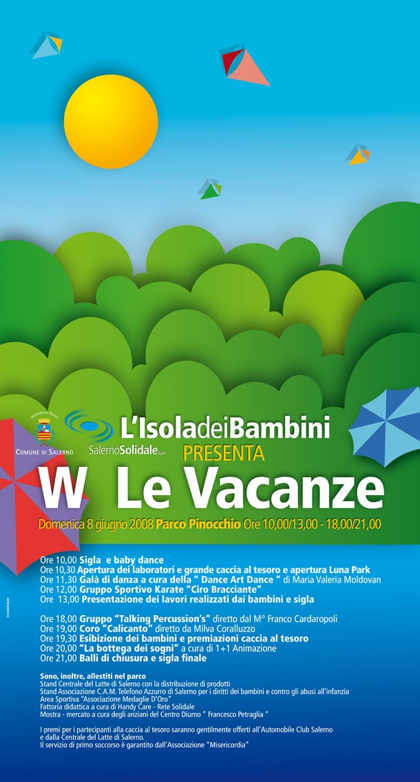 A fare da scenografia a questa edizione straordinaria dell’Isola dei Bambini lo Stand della Centrale del Latte di Salerno che come d’abitudine distribuirà le proprie merendine ai ragazzi e lo stand dell’Associazione C.A.M. Telefono Azzurro di Salerno, impegnata quotidianamente nella lotta contro tutte le forme di abuso sull’infanzia e per la promozione dei diritti dei bambini.