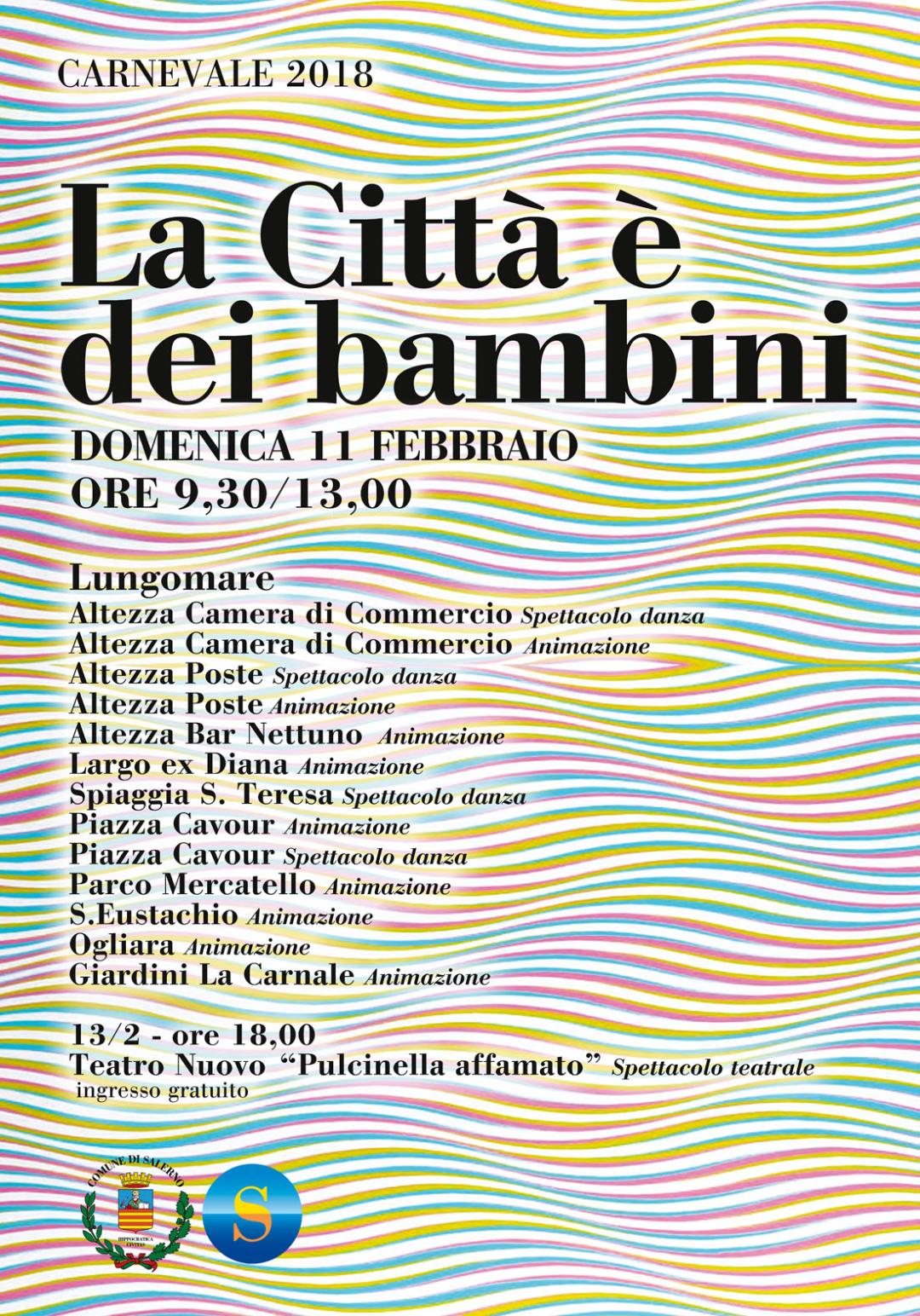 "La Città è dei bambini": a Carnevale torna il tradizionale appuntamento dedicato ai più piccoli. Domenica 11 febbraio, dalle 9.30 alle 13.00, sono in programma spettacoli ed eventi di animazione sul lungomare cittadino, nei parchi e nelle principali piazze del centro e dei quartieri. A conclusione della manifestazione martedì 13, alle ore 18.00, presso il Teatro Nuovo, si terrà lo spettacolo teatrale (a ingresso gratuito) "Pulcinella affamato".