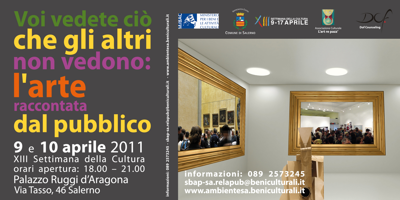 Sabato 9 aprile 2011 presso la sala conferenze di Palazzo Ruggi d’Aragona alle ore 18.00, in occasione della XIII Settimana della Cultura, la Soprintendenza BAP di Salerno e Avellino, diretta da Gennaro Miccio, ed il Comune di Salerno presentano la sperimentazione "L’arte raccontata dal pubblico", a cura dell’Associazione culturale L’art re pazz’ e Dof Counseling.