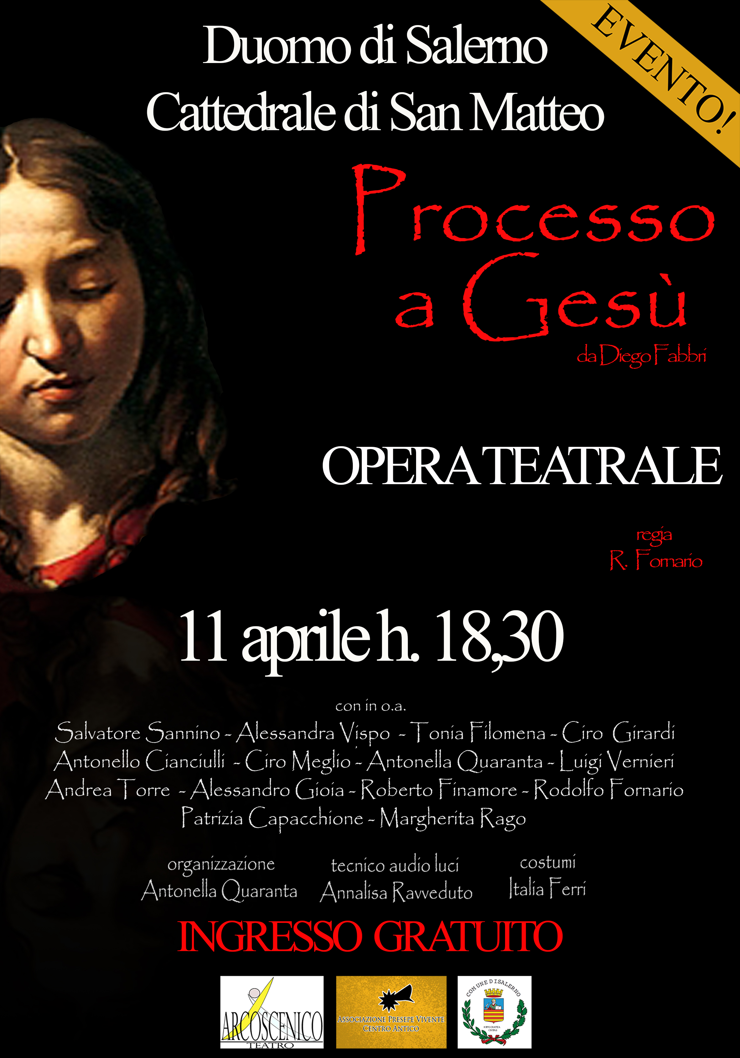 Martedì 11 aprile, alle ore 18.30, presso il Duomo di Salerno, l’Associazione Teatrale Arcoscenico metterà in scena lo spettacolo teatrale "Processo a Gesù" di Diego Fabbri, nella riduzione curata Rodolfo Fornario che cura anche la regia.