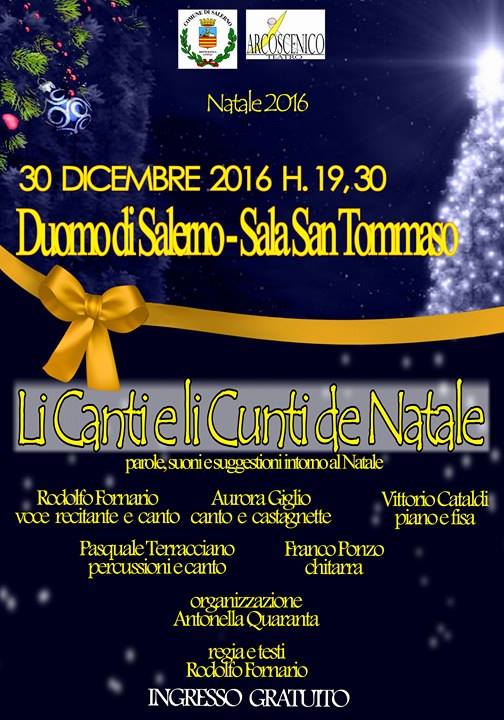 Venerdì 30 dicembre, alle ore 19.30, presso la Sala San Tommaso del Duomo di Salerno, si terrà il concerto "Li Canti e li Cunti de Natale" - Parole, suoni e suggestioni intorno al Natale.