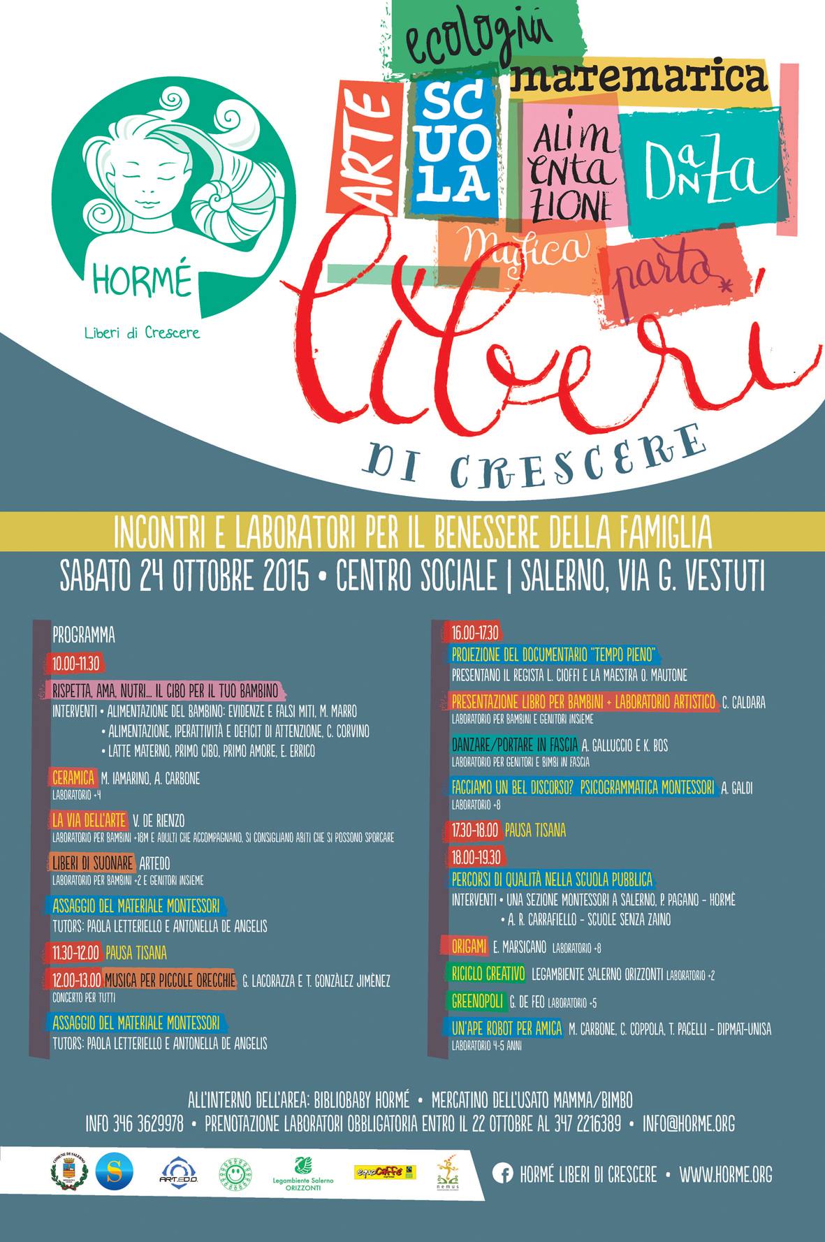 “Liberi di crescere” è un evento organizzato dall’associazione Hormé per promuovere uno stile di vita in cui al centro c’è il bambino e i suoi bisogni di crescita. Due i temi affrontati nella prima edizione di “Liberi di Crescere”, la scuola e l’alimentazione, che avrà luogo sabato 24 ottobre dalle ore 10.00 alle ore 19.30 al Centro Sociale di Salerno.