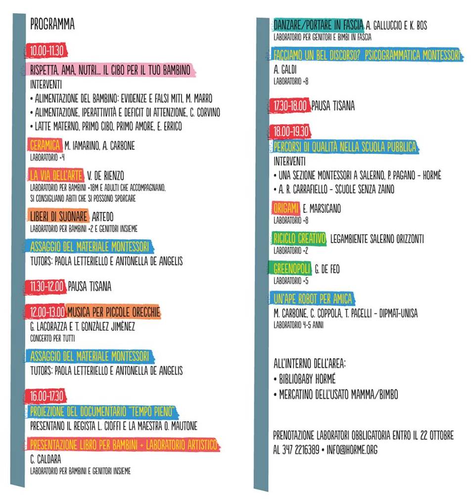 In parallelo agli incontri informativi ci saranno laboratori per adulti e bambini con materiale didattico Montessori, laboratori di arte, laboratori matematica in collaborazione con Prof. Tortoriello e Dott. sa Coppola di Unisa, di psicogrammatica, musica e danza e il concerto “Musica per piccole orecchie” con G. Lacorazza e T. Gonzales Jimenez.