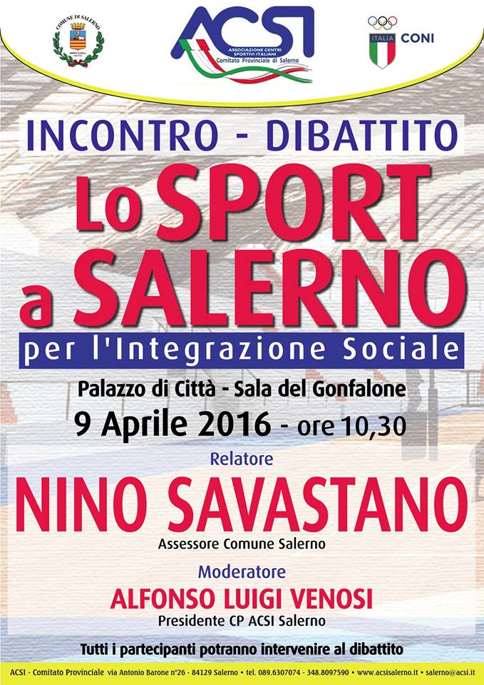 L'evento, promosso dall'ACSI Salerno, ha lo scopo di promuovere e riaffermare il ruolo dello sport quale strumento formidabile di integrazione e recupero sociale, sia per alcune categorie di minori che per giovani e meno giovani con problematiche diverse. Saranno discussi criteri e metodi riguardanti lo sport per disabili, per i minori dei quartieri periferici, per gli anziani e per il mondo giovanile in generale.