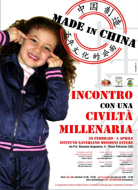 Ha preso il via il 26 febbraio 2009 alle 20.30 la manifestazione Made in China: incontro con una civiltà millenaria realizzata dai Missionari Saveriani e dall’Associazione Laici Saveriani Ad Gentes, da anni impegnati nel campo dell’intercultura e della mondialità, con il patrocinio del Comune di Salerno.