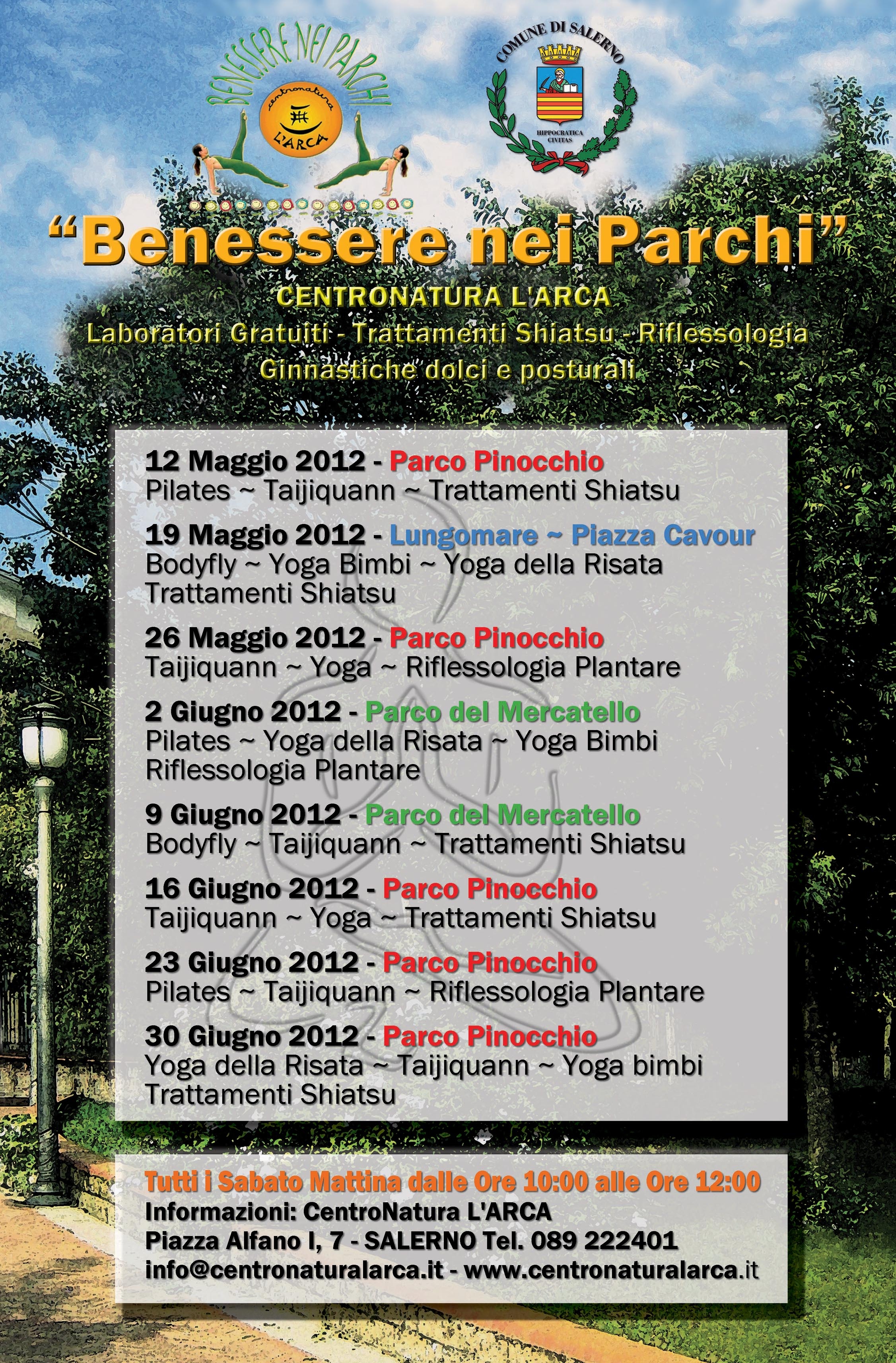 Il CentroNatura L’Arca - Discipline Bionaturali Orientali e Occidentali, in collaborazione con il comune di Salerno, organizza l’evento “Benessere nei Parchi”. Il programma prevede un ricco calendario di incontri per tutto il mese di maggio e di giugno nei parchi cittadini. Gli incontri, aperti a tutti e a tutte le fasce d’età, hanno lo scopo di promuovere un maggiore benessere psico-fisico della persona attraverso la sperimentazione delle discipline olistiche in contatto con la natura.