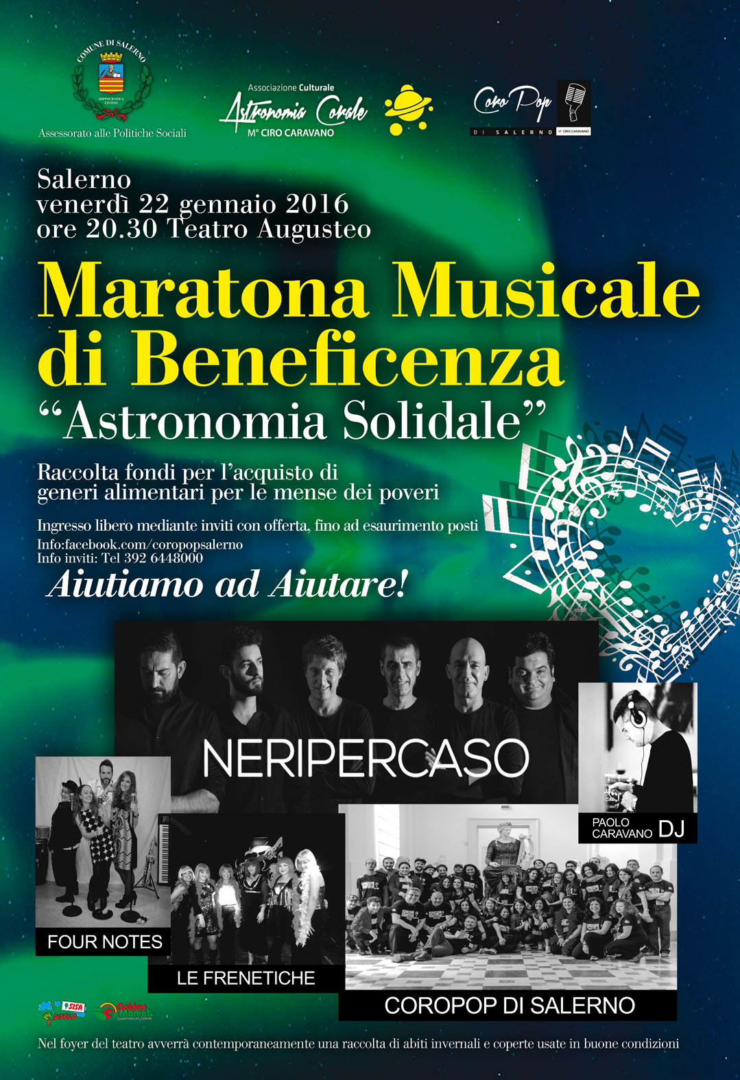 Si tratta di una maratona musicale con lo scopo di raccogliere fondi per l’acquisto di generi alimentari – in partnership con Supermercati SISA Golden Market – mediante ingresso ad invito con offerta fino ad esaurimento posti, con la partecipazione speciale del più importante gruppo “a cappella” italiano: i Neri per Caso, proprio nel giorno in cui ci sarà il lancio mondiale del loro ultimo lavoro discografico “NPC 2.0”. La serata, sotto la direzione artistica del M° Ciro Caravano – noto al pubblico come uno dei cantanti ma anche produttore, arrangiatore e direttore dei Neri per Caso – sarà condotta dai diversi gruppi artistici presenti all’interno dell’Associazione: Il CoroPop di Salerno, fiore all’occhiello di Astronomia Corale, diretto dallo stesso M° Ciro Caravano, composto da 48 cantanti non professionisti uniti da una profonda amicizia e da una irrefrenabile passione per il canto “a cappella” che eseguiranno brani pop nazionali ed internazionali . I Four Notes, affiatato quartetto sorrentino di voci e suoni che proporranno un viaggio musicale nel tempo, dal 1950 ad oggi. Le coloratissime e coinvolgenti Frenetiche, scatenata “girl band” con repertorio dance anni ’70. DJ Paolo Caravano per chiudere ballando col suo percorso musicale Funk, Disco, Hip Hop e House “quality selected”.