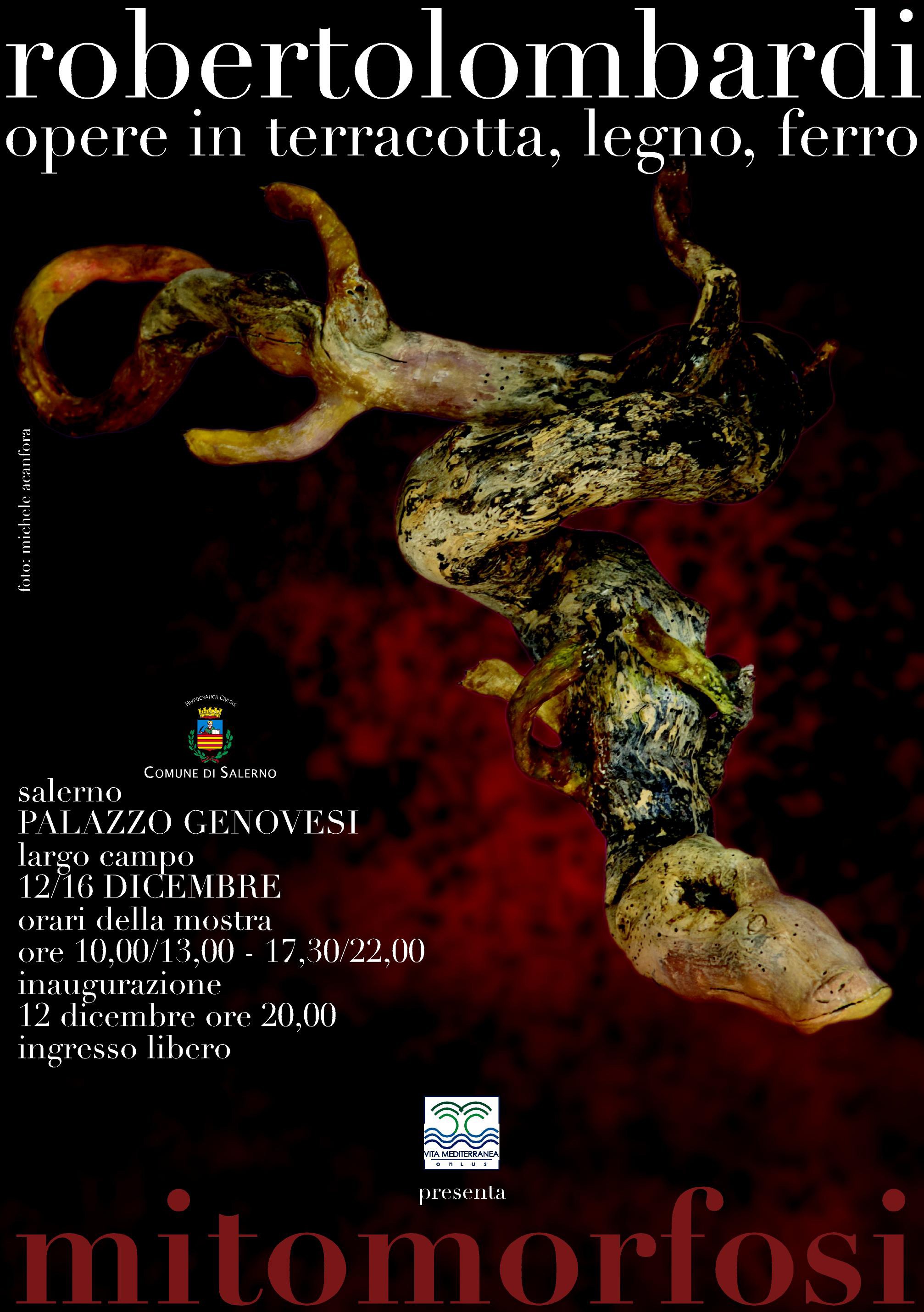Dal 12 al 16 dicembre palazzo Genovesi, in largo Campo a Salerno, ospiterà la mostra “Mitomorfosi”, una personale di Roberto Lombardi. Una trentina le opere in mostra; figure antropomorfe realizzate in prevalenza con creta, legno e ferro, ma anche ossa, chiodi, nidi di vespe, pietre, stoffa. Roberto Lombardi è noto al pubblico salernitano in veste di attore, autore teatrale e di testi linguistico-umoristici: “Il Piccolo Zingarello è il libro che gli portò fortuna nel ’93 e che da pochi mesi è stato riedito in una seconda edizione ampliata. Chi visiterà la mostra si troverà di fronte a un inedito Roberto Lombardi; le figure realizzate -monche, cadenti, sfigurate- raccontano di un tempo lontano in cui ancora qualcosa di divino, o almeno di eroico, abitava l’uomo, e del tempo contemporaneo dove l’uomo stesso si è perso, fino a divenire più simile a quella materia, raccolta letteralmente per strada, con la quale Lombardi realizza le sue figure disumanizzate.