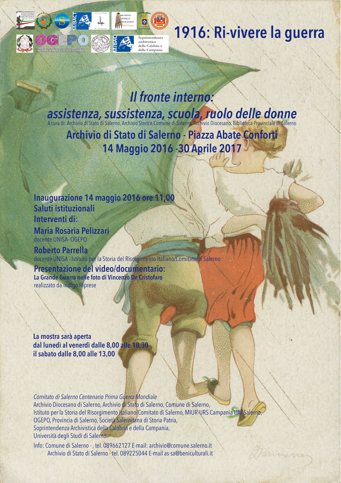 Si inaugura sabato 14 maggio, alle ore 11.00, presso l’Archivio di Stato in Piazza Abate Conforti, la mostra documentaria dal titolo: “1916 Ri-Vivere la guerra” Il fronte interno: assistenza, sussistenza, scuola, ruolo delle donne. La mostra è organizzata dall’Archivio Storico del Comune, dall’Archivio di Stato di Salerno, dall’Archivio Diocesano e dalla Provincia di Salerno-Biblioteca Provinciale con la collaborazioni di alcuni privati e rientra nelle iniziative che ormai da tre anni il Comitato per la I Guerra Mondiale propone. Infatti dopo aver raccontato il dibattito sulla stampa e in Parlamento del 1914, dopo “aver affrontato” le giornate frenetiche del 1915 allo scoppio della guerra e “visitato le trincee”, questo anno vedremo gli effetti della guerra nella vita quotidiana ri-vivremo il clima di sofferenza e di speranza che le donne e i bambini rimasti “a casa” affrontavano quotidianamente.