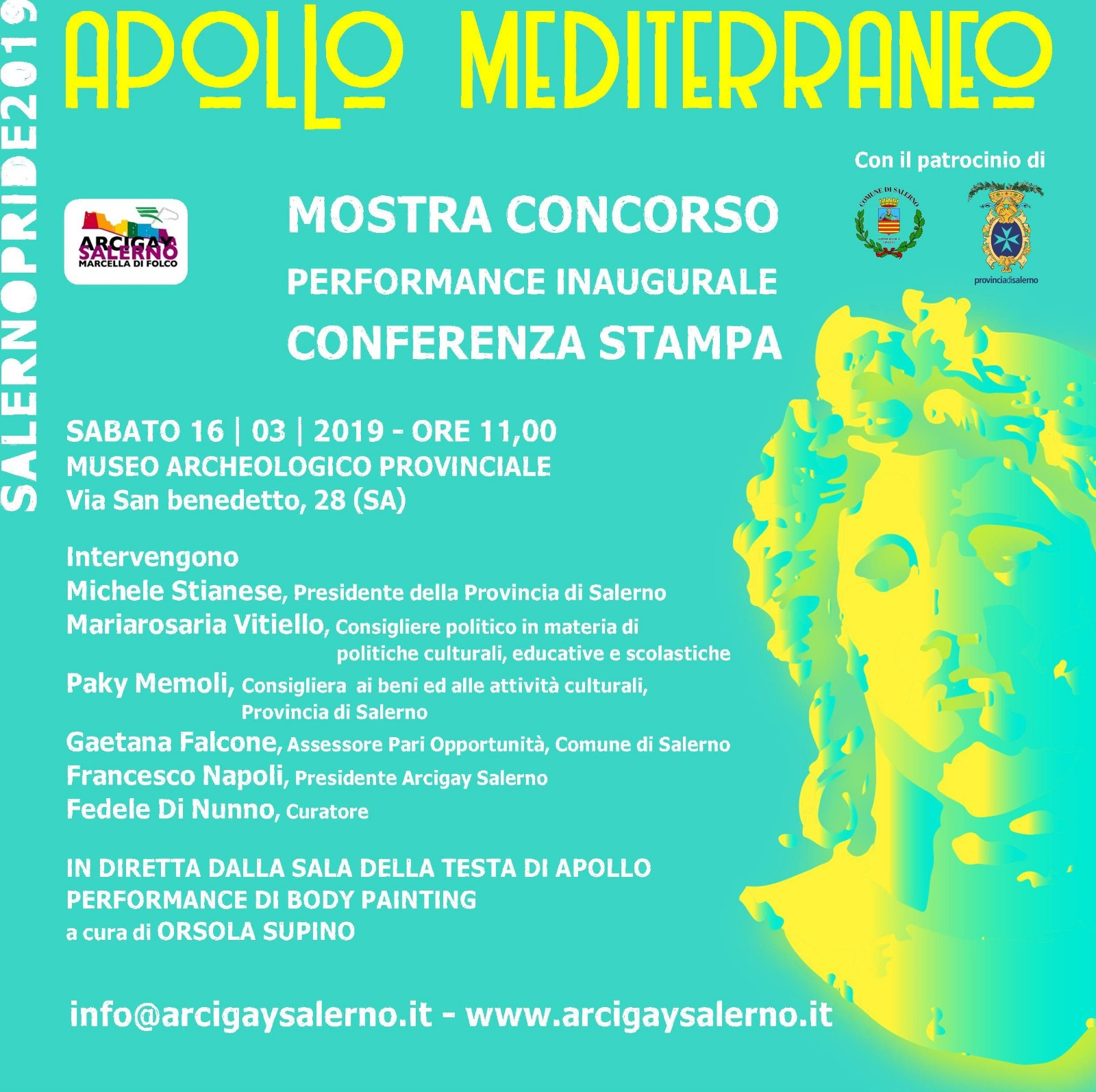 In occasione del SalernoPride2019, il Comitato Arcigay Salerno "Marcella Di Folco" propone la Mostra Concorso APOLLO MEDITERRANEO, un evento che intende coinvolgere gli artisti locali e valorizzare il patrimonio artistico-culturale della provincia di Salerno. L'iniziativa sarà presentata nel corso di una Conferenza Stampa SABATO 16 MARZO ALLE ORE 11 presso il Museo Archeologico Provinciale, in Via Bastioni 28 - Salerno anche grazie al Patrocinio della Provincia di Salerno e del Comune di Salerno. Nel corso della conferenza stampa, in diretta dalla Sala della Testa di Apollo, sarà possibile assistere alla performance di Body Painting a cura di Orsola Supino.